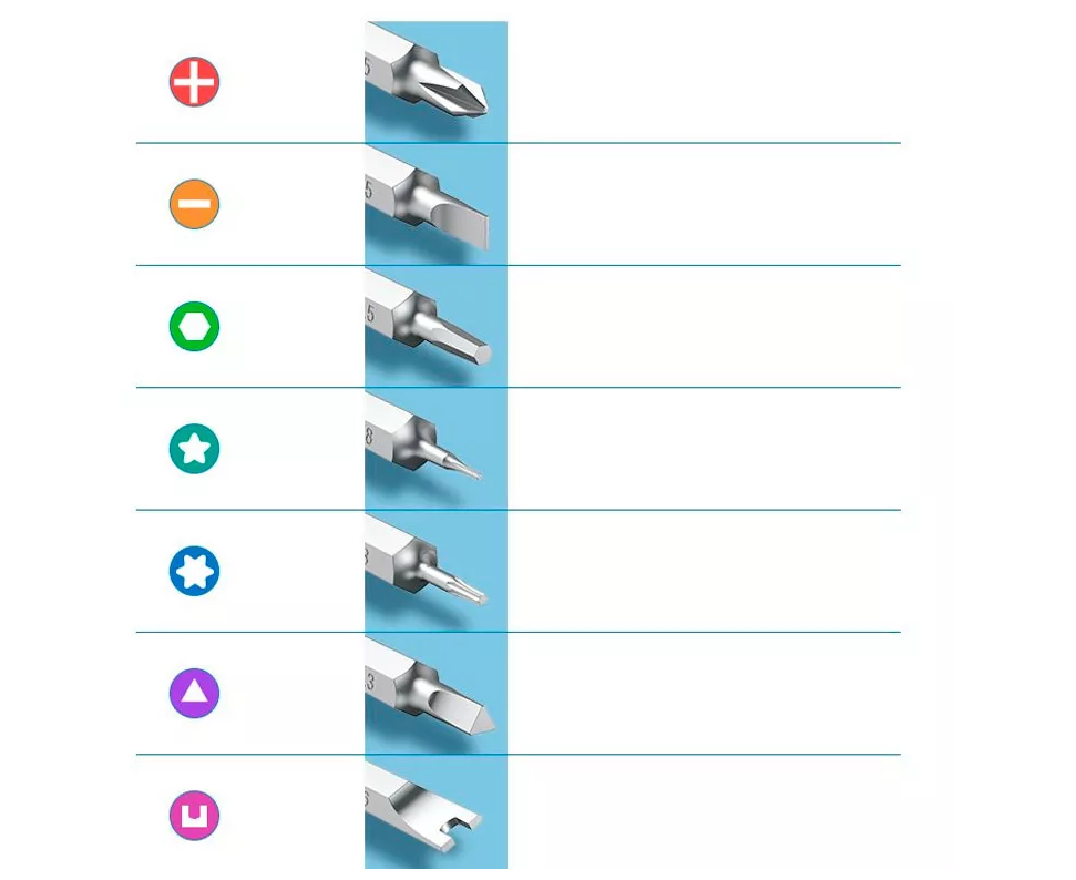 Phillips - 1.0, 1.5, 2.0, 2.5, 3.5, Шлицевая - 1.0, 1.5, 2.0, 2.5, 3.0, 3.5, 4.0, Pentalobe - 0.8, 1.2, Torx - T3 - T10 + T15, T20, Tri-wing- 0.8, 2.0, Гаечный ключ - 1.6, Звезда - 0.8, 1.2, Pozidriv - Y0.8, Y2.0