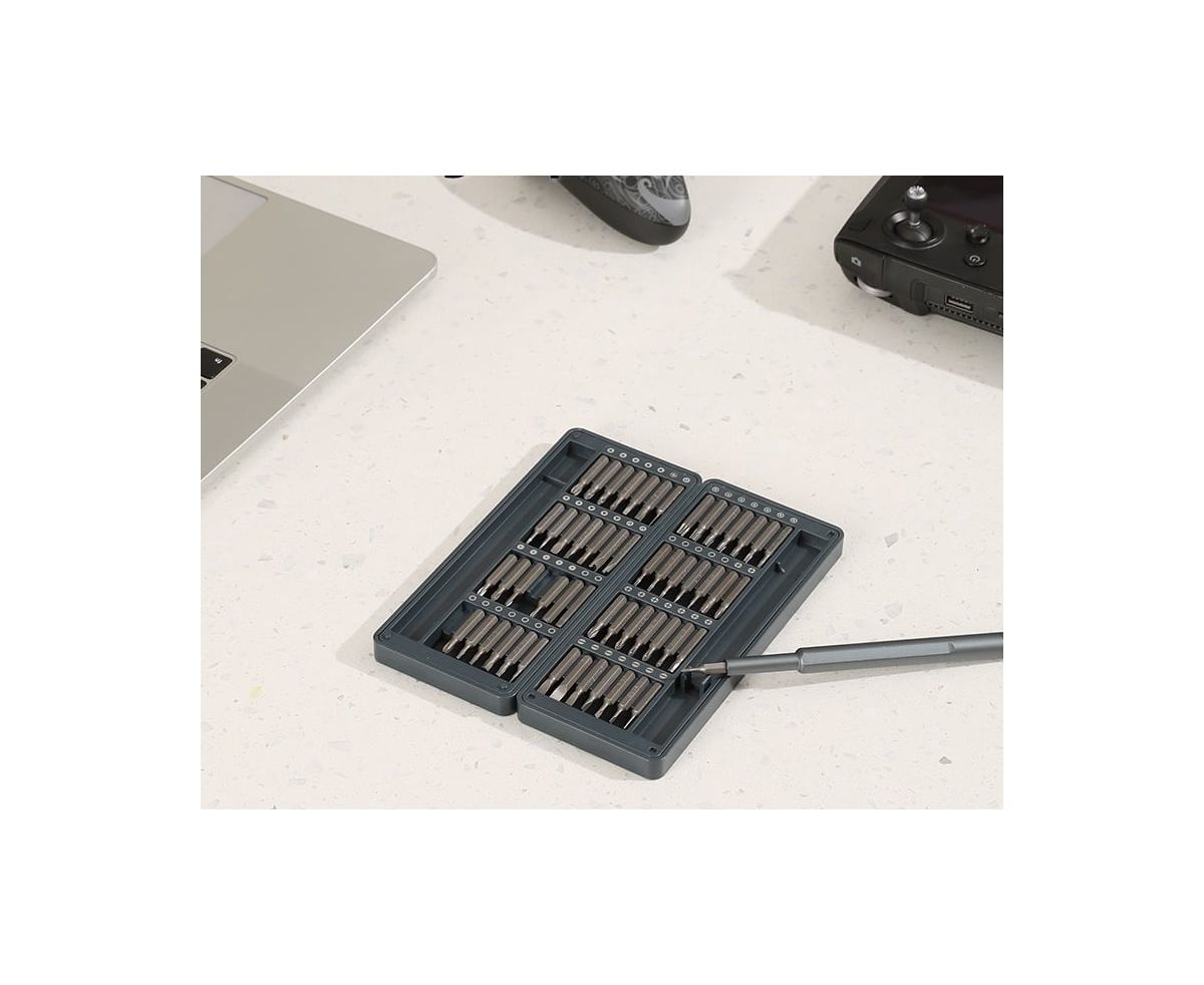 Он включает в себя саму отвертку и целых 56 бит различного типа к ней, что обеспечивает широкий выбор инструментов для разного типа винтов.