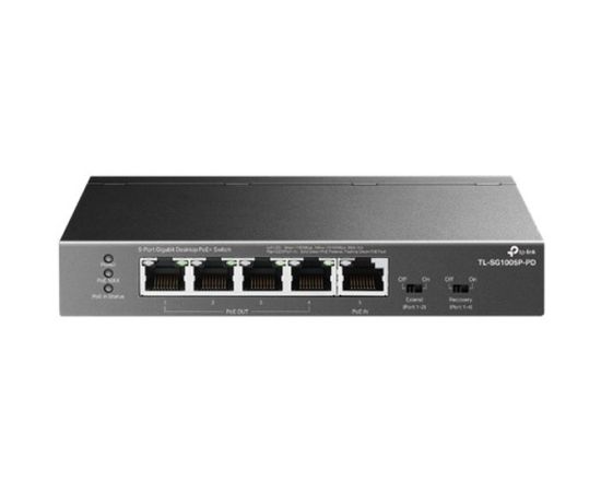 Настольный коммутатор TP-Link TL-SG1005P-PD, с 5 гиг. портами (1 порт с входящим PoE++, 4 порта с исходящим PoE+), бюджет PoE: 9, 21, 47 или 66Вт