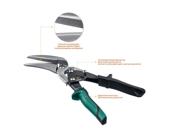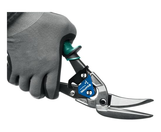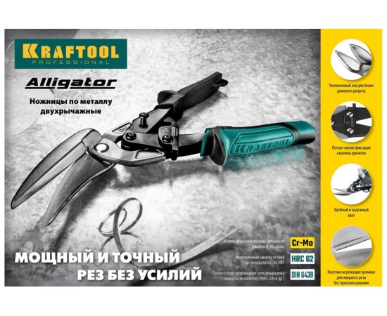 Ножницы по металлу KRAFTOOL Alligator, правые удлинённые, 280 мм 2328-RL применяются для прямой и фигурной резки (в правую сторону) листовых материалов из стали повышенной твердости, нержавеющей стали, цветных металлов. Изготовлены из хромомолибденовой стали. Индукционная закалка лезвий до твердости 62 – 65 HRC. Насечки на режущих кромках препятствуют соскальзыванию материала в процессе реза. Инновационный фиксатор: легкое снятие фиксации сжатием рукояток, фиксация одной рукой. Высокомощный двухрычажный механизм обеспечивает эффективный точный рез. Увеличенный зев облегчает рез твердой стали без заусенцев. Двухкомпонентные рукоятки обеспечивают удобство и надежный захват при работе.