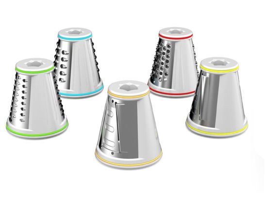 терка: 1 в комплекте, насадка для нарезки ломтиками: 4 в комплекте, общее число насадок: 5