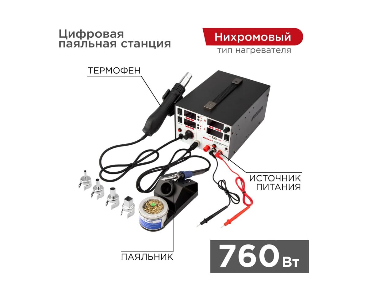 Паяльная станция REXANT 12-0729 3 в 1 паяльник+термофен+источник питания, 100-480 С