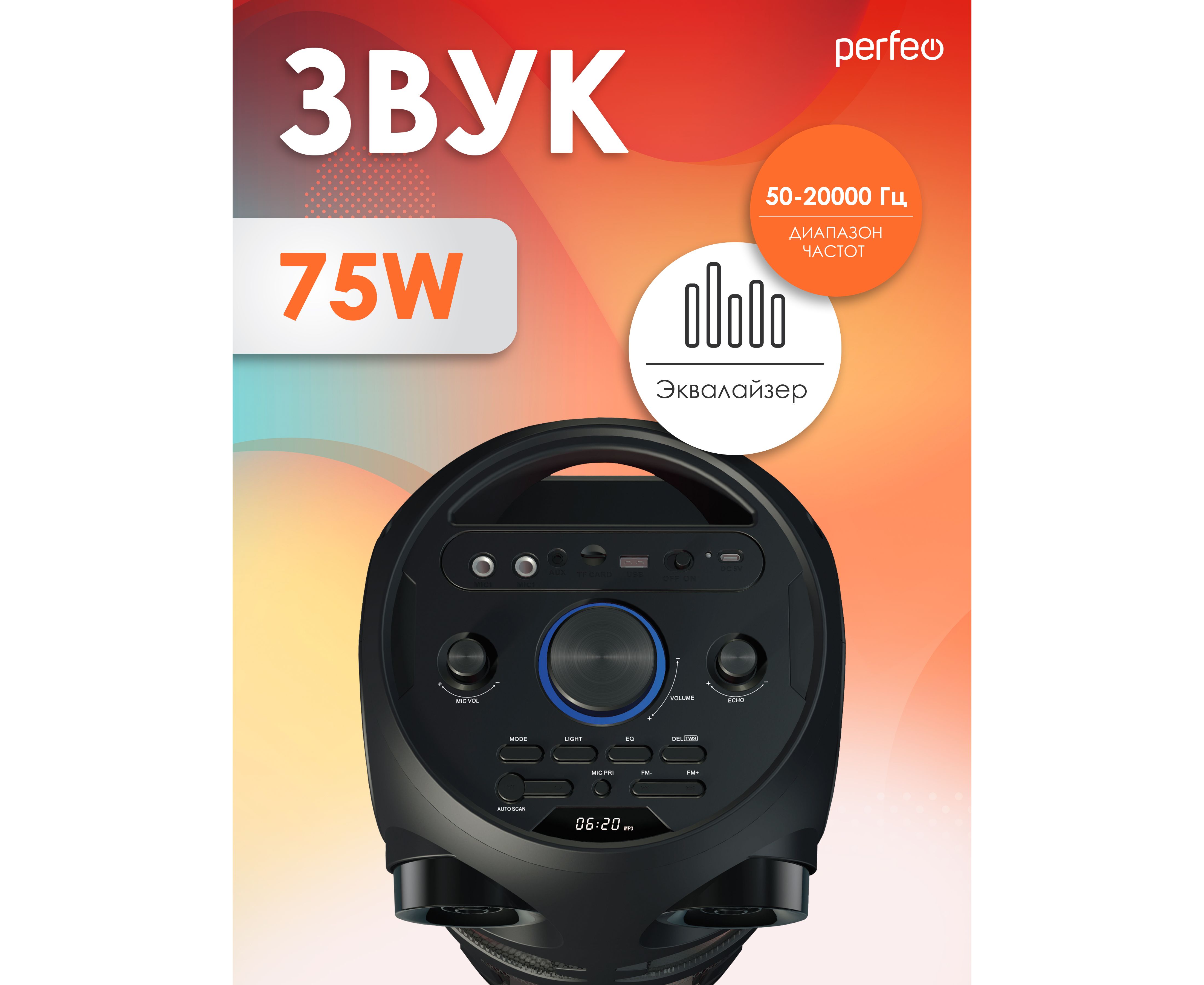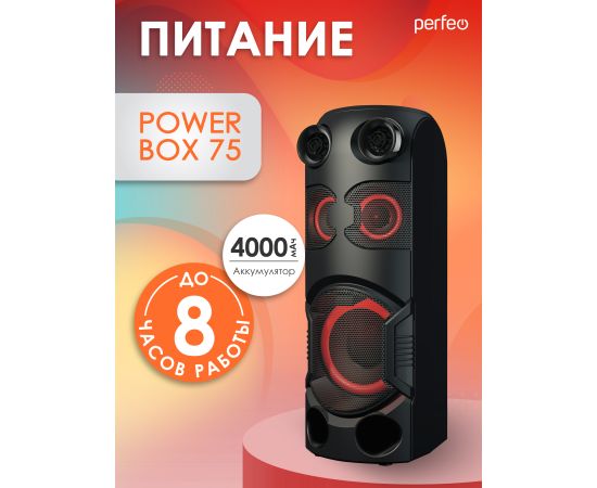 Беспроводная колонка Perfeo Power Box 75 - это громкая, мощная, беспроводная колонка с чистым звуком на 75 Вт в комплекте с эквалайзером, пультом ДУ и подсветкой. Портативная блютуз колонка универсальная, подходит для телефона, смартфона, планшета, ноутбука. Подключается посредством блютузом или кабелем через AUX разъем, а встроенный в беспроводную напольную колонку плеер воспроизводит micro sd и usb флешкой карты памяти. Радиоприемник с проигрыванием FM радиостанций для любителей использовать портативку как аудиосистема. В комплекте идет беспроводной микрофон! Также есть два входа для микрофона, чтобы исполнять караоке или подключать электро-гитару. Музыкальная колонка Power BOX 75 от Perfeo – это мощная, переносная станция с подсветкой и караоке для применения на даче, для дома, улице, или озвучивания спортзала, танцевальных занятий, йоги, фитнеса. Мобильная акустическая система со светомузыкой и эквалайзером позволит вам 8 часов наслаждаться чистым звуком и любимыми песнями. Мы указываем честное время проигрывания музыки. Это отличный подарок как для подростков и детей: мальчиков и девочек, так и для взрослых. Супер предложение для того чтобы стать центром шумной вечеринки. Динамическая RGB-подсветка, способная раскрасить ваше пространство. Режимы подсветки помогут адаптировать работу светомузыки под разные мелодии — от динамичных треков, до спокойной, размеренной мелодии. За качественное звучание отвечают ПЯТЬ динамиков. Портативная акустическая система — это не просто большая беспроводная колонка, а настоящий мобильный центр развлечений. Надежный инструмент для проведения шумных мероприятий, будь то свадьба, для праздников, дискотека или умиротворенная медитация. Отличный подарок на новый год! Для детских праздников. Для спортивных мероприятий. С портативностью и качеством звука, эта колонка гарантирует удобство использования. Ее дизайн и функциональность сделают любую вечеринку незабываемой.
