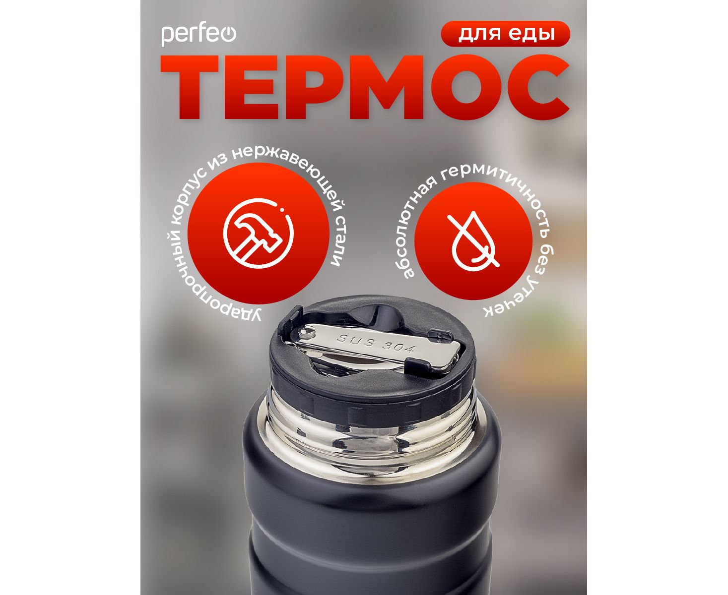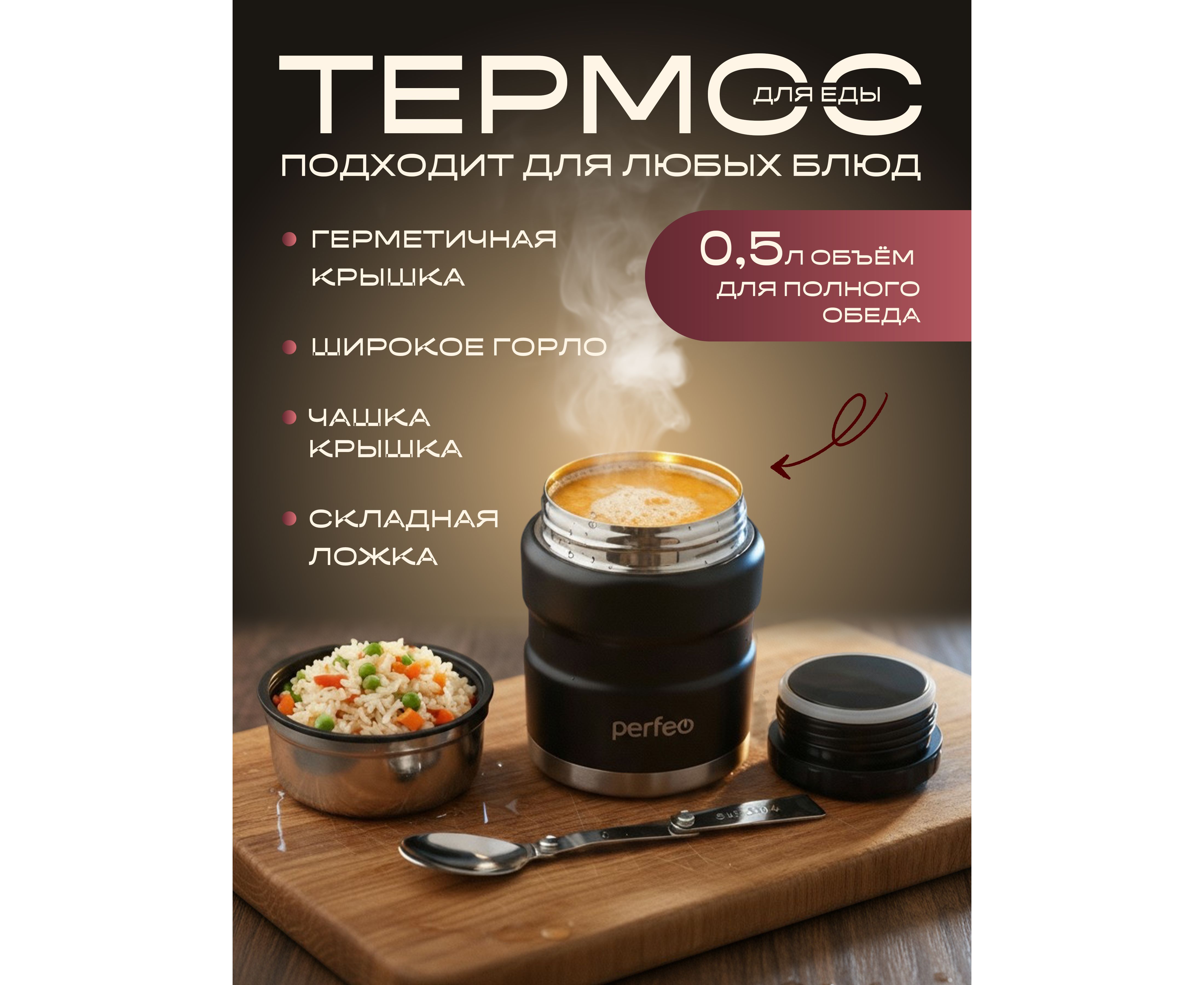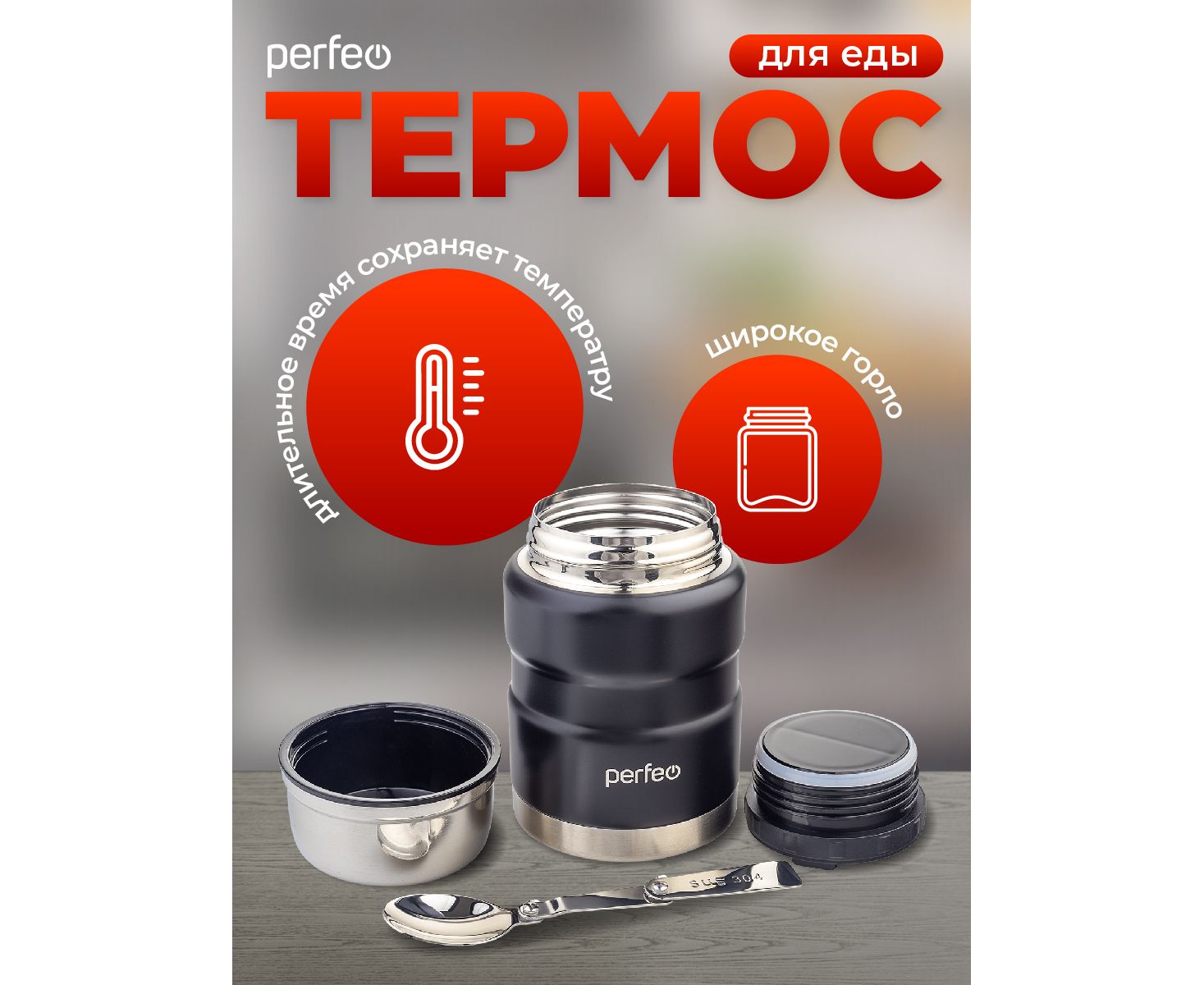 Термос для еды PERFEO с широким горлом, ложкой, объем 0,5 л., черный, (Арт. PF_E1371)