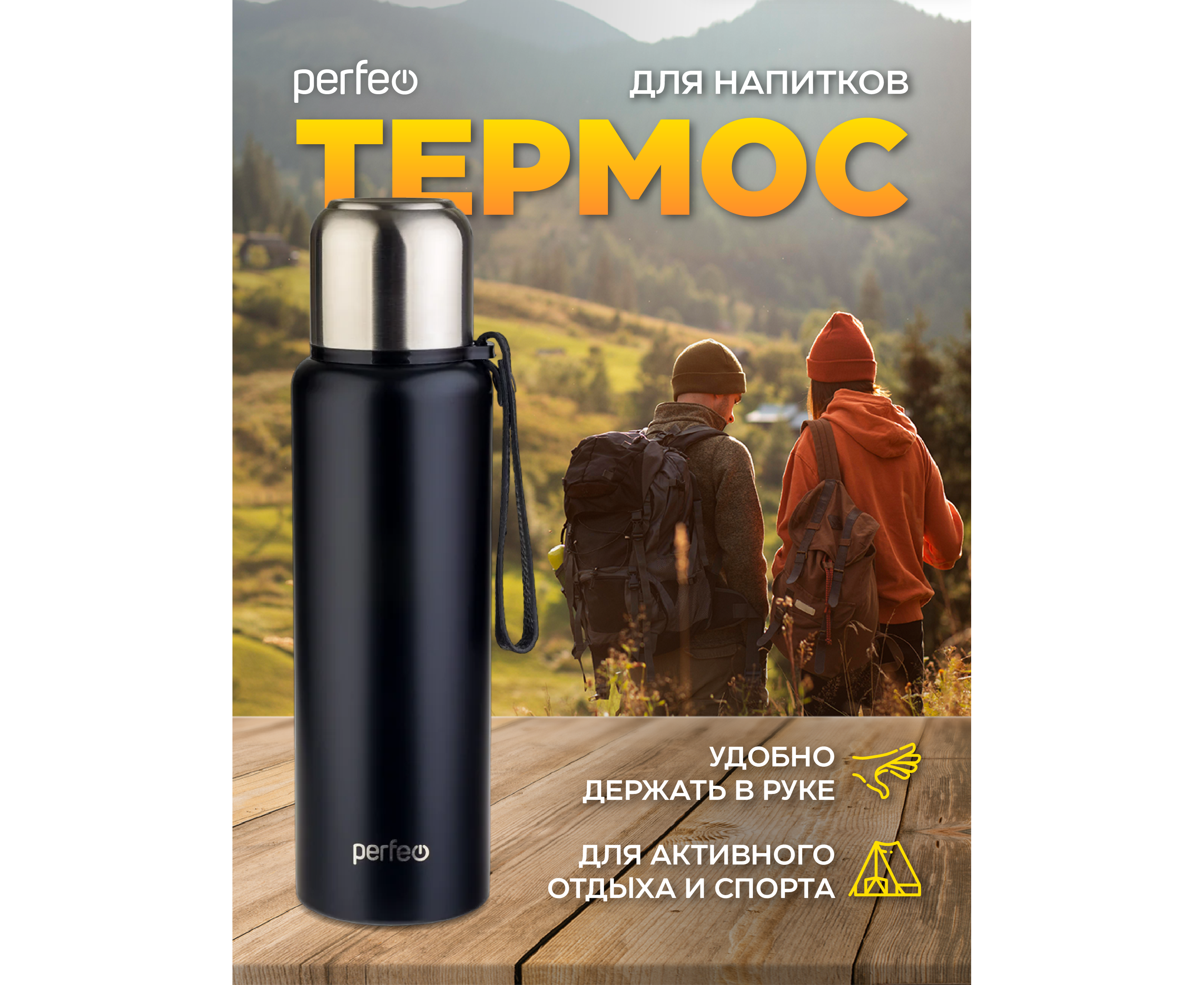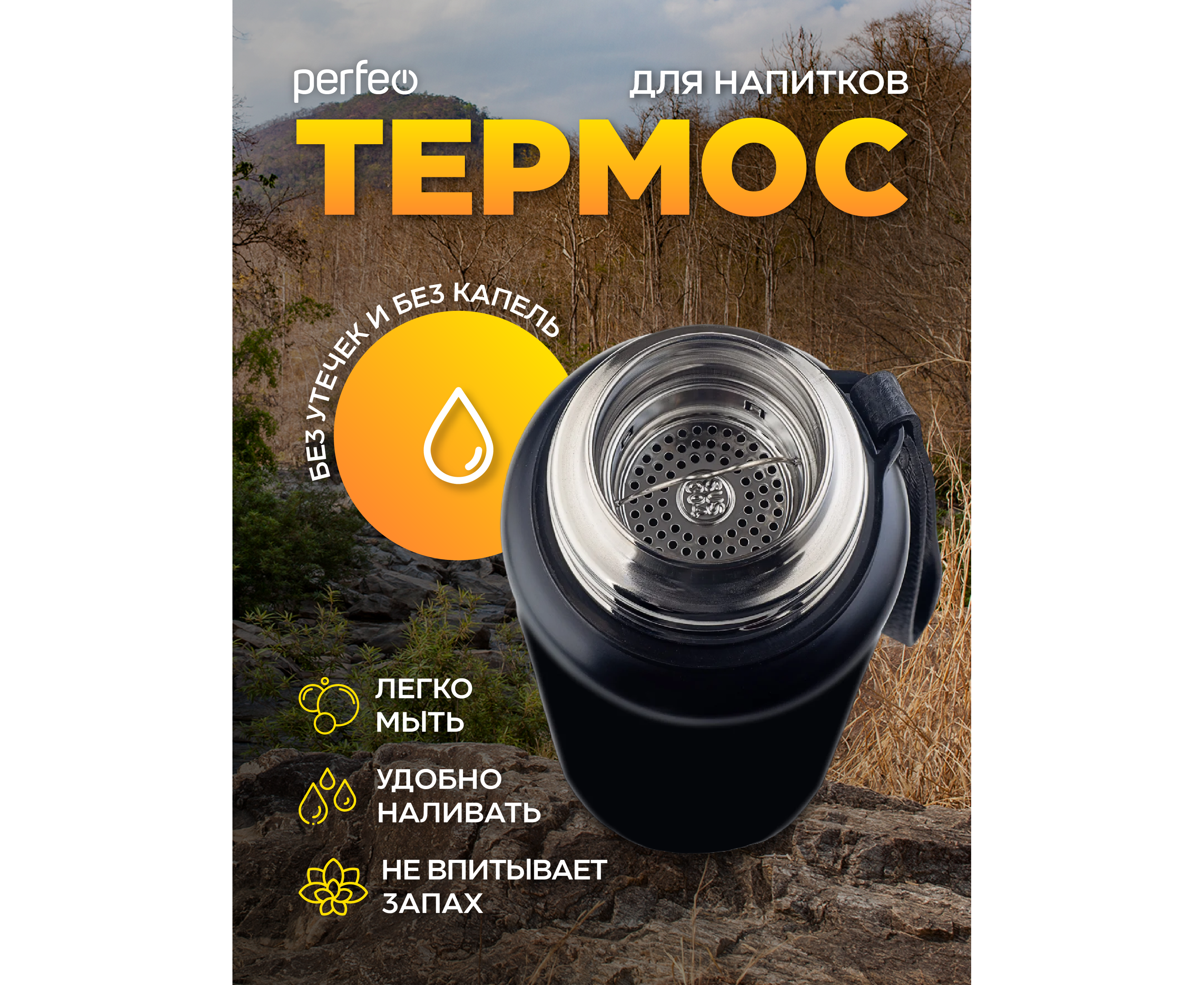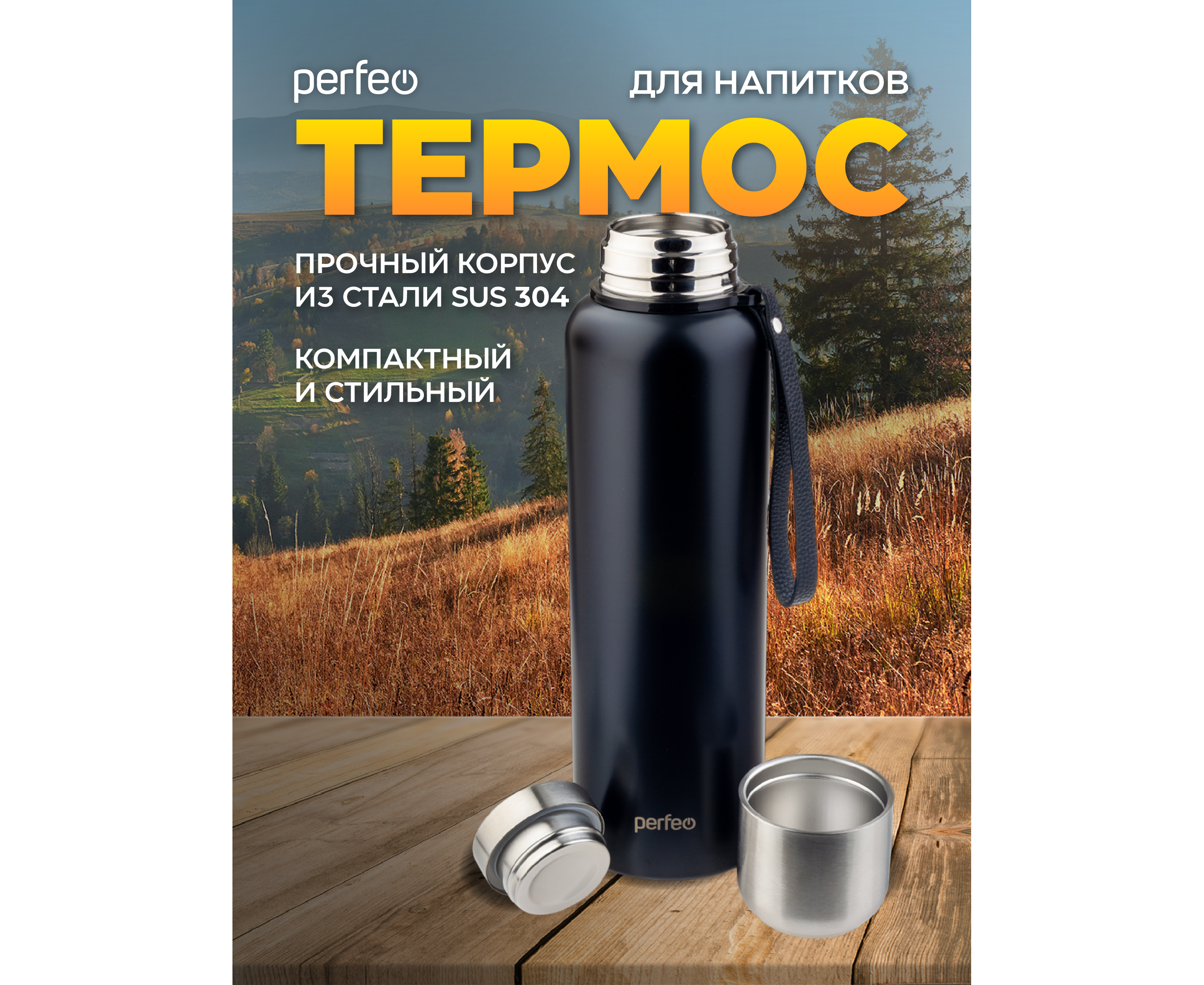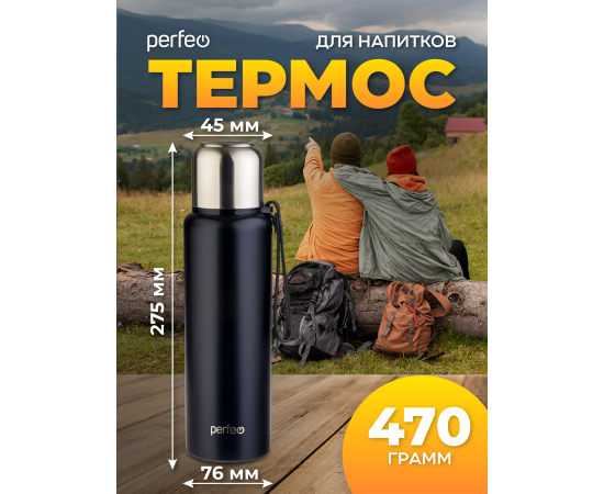 Термос для напитков PERFEO с глухой пробкой, ситечком, ремешком, объем 0,8 л., черный, (Арт. PF_C3705)