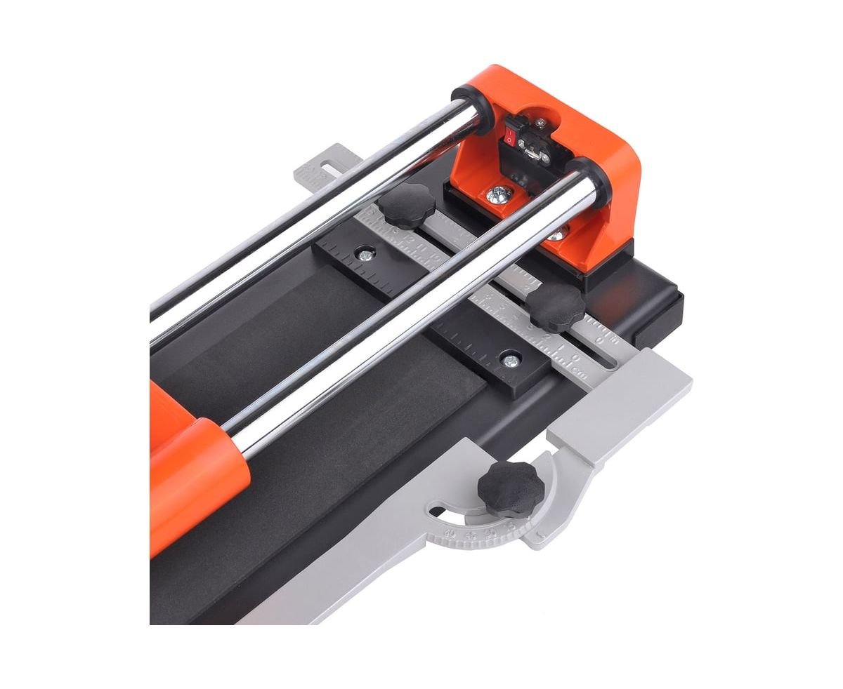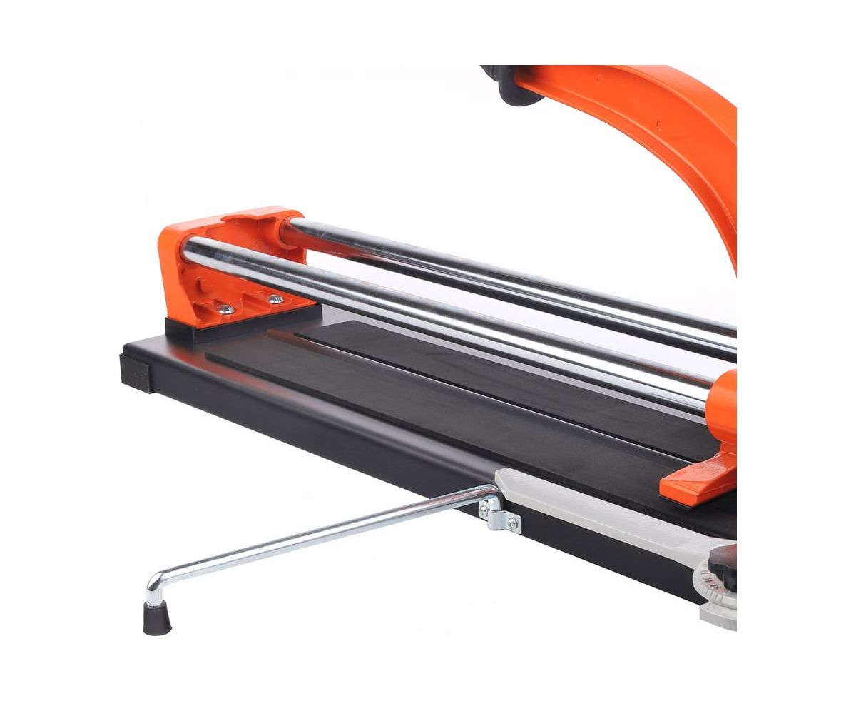 Модель имеет линейку-угольник для резки плитки под углом 30-45-60°, регулировки размера, дополнительной фиксации отрезаемой заготовки и точного положения плитки.