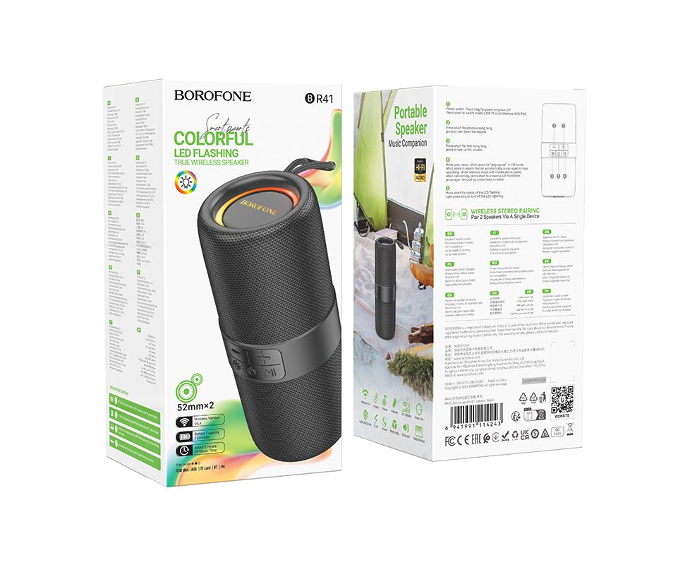 Borofone BR41 имеет ударопрочный и водонепроницаемый корпус, соответствующий стандарту IPX5, что делает её устойчивой к брызгам воды и пыли. Аккумулятор ёмкостью 1200 мАч обеспечивает до 2 часов автономной работы.