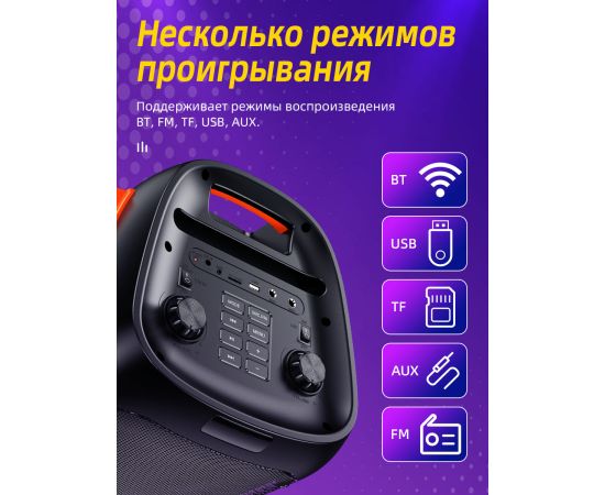 Поддерживает BT, TF-карту, USB-накопитель, AUX, FM и другие режимы.