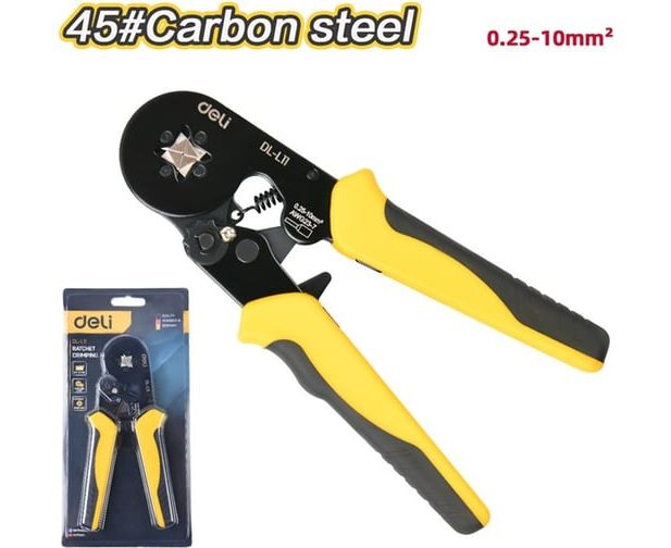 Пресс-клещи Deli DL-L11 предназначены для обжима наконечников НШВИ сечением от 0,25 до 10 кв.мм, что делает их универсальным решением для электромонтажных работ.