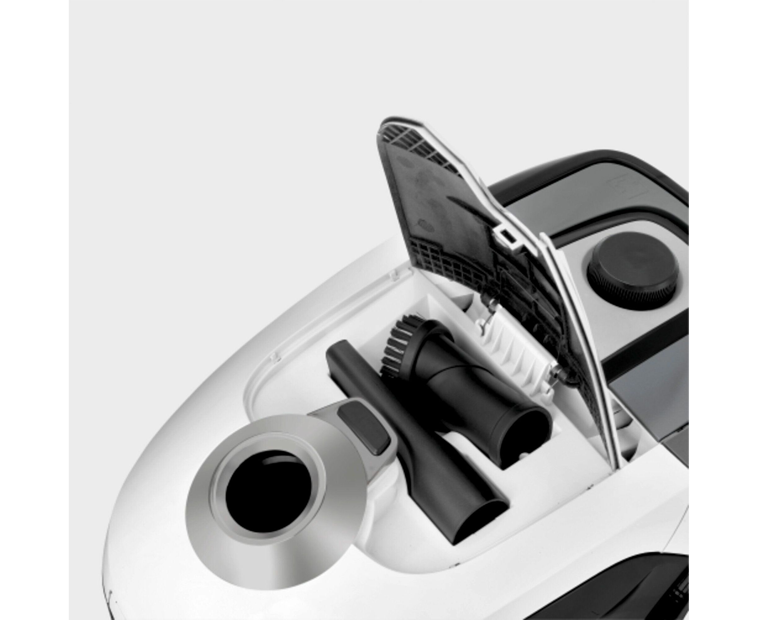 насадка для мягкой мебели, универсальная насадка для сухой уборки, щелевая насадка, всасывающий шланг 1,5 м с изогнутой рукояткой, крепление насадок на удлинительной трубке, насадка для пола, телескопическая удлинительная трубка, фильтр НЕРА 12