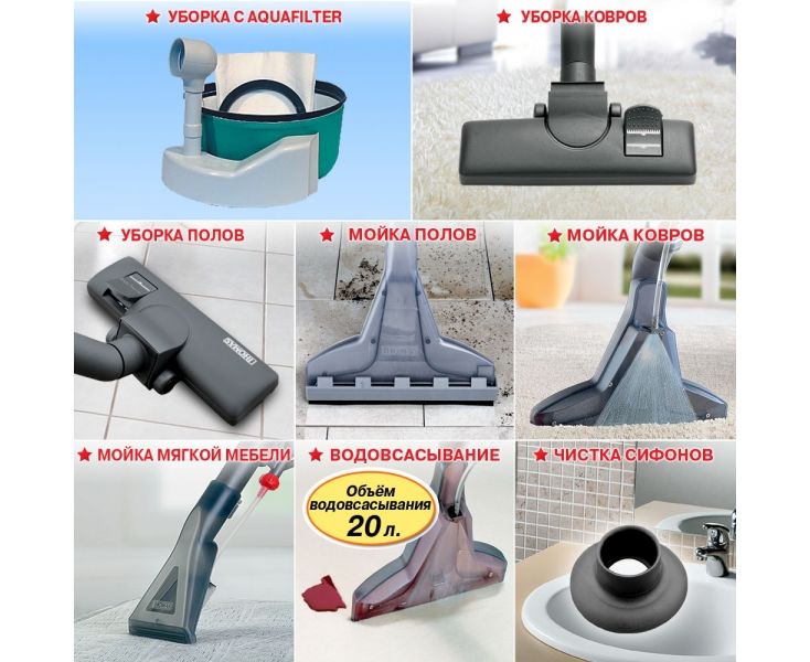 Особенности: Мощный моющий пылесос с аквафильтром и объемом бака для мусора 20 литров. Простое управление.