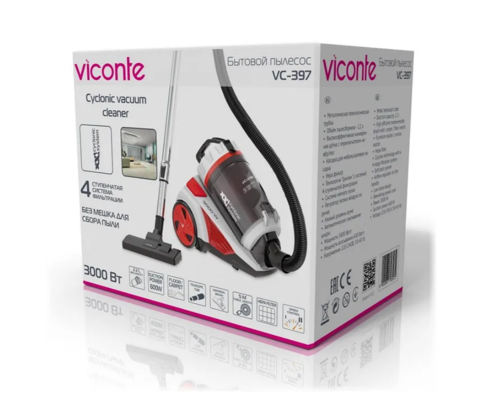 Пылесос Viconte VC-397 мощность 3000 W , Бытовой пылесос, мощность 3000 Вт, мощность всасывания - 600 Вт, эффективная система очистки воздуха «Циклон» с 4-х ступенчатой системой фильтрации воздуха, объем пылесборника 2,2 л, лёгкая очистка контейнера, НЕРА фильтр - обеспечивает очистку воздуха до 99.9%, металлическая телескопическая трубка, регулятор скорости на корпусе, регулятор потока воздуха на ручке, длина шнура питания 5 м, автоматическая смотка шнура. В комплекте: щётка с переключателем ковёр/пол, насадка "мебель/щель".