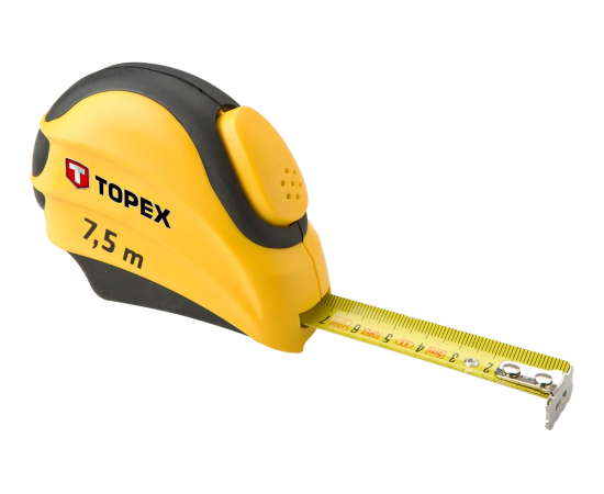 Рулетка TOPEX 27C387 стальная, автоматическая блокировка сматывания ленты, двухкомпонентный корпус, двойной лаковое покрытие