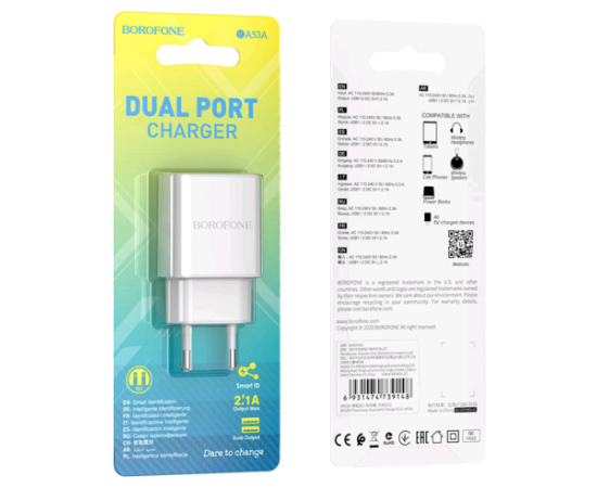 Сетевое зарядное устройство Borofone BA53A обладает мощностью 10.5W. Устройство имеет два USB порт c током 2.1 А. Оснащен материалом огнестойким, что не позволяет перегреваться. Входное напряжение 100-240W.