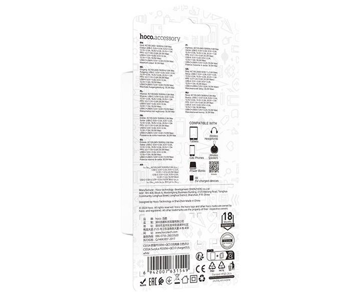 Сетевое зарядное устройство HOCO CS55A/ СЗУ/ PD + QC 3.0/ 2 USB: Type-C + Type-A/ Выход: 30W+18W/ Белый