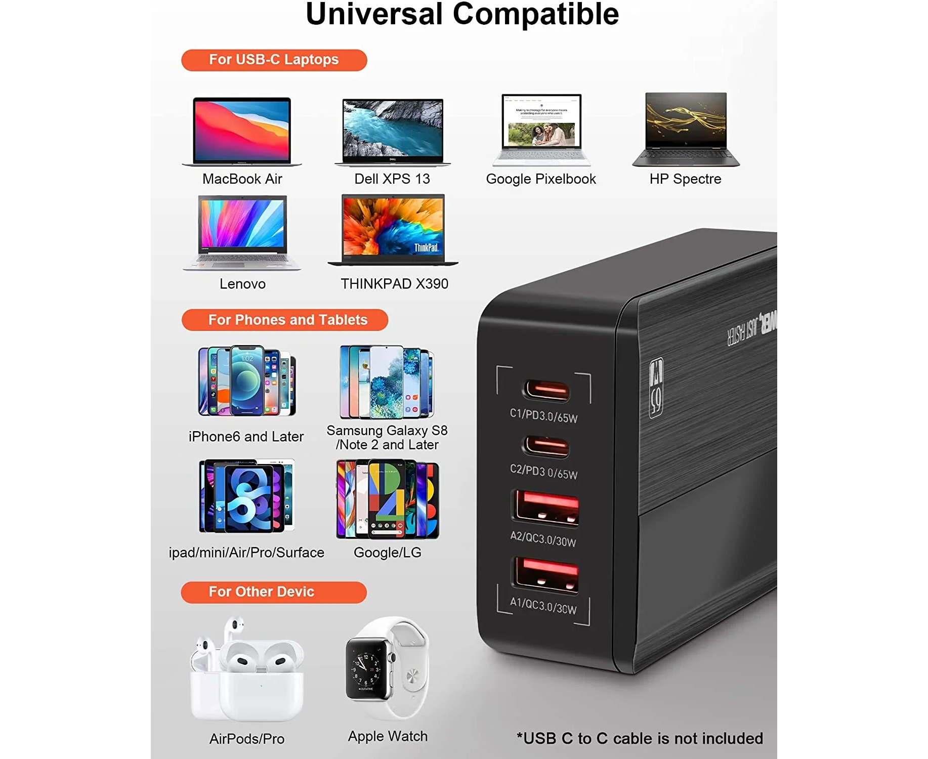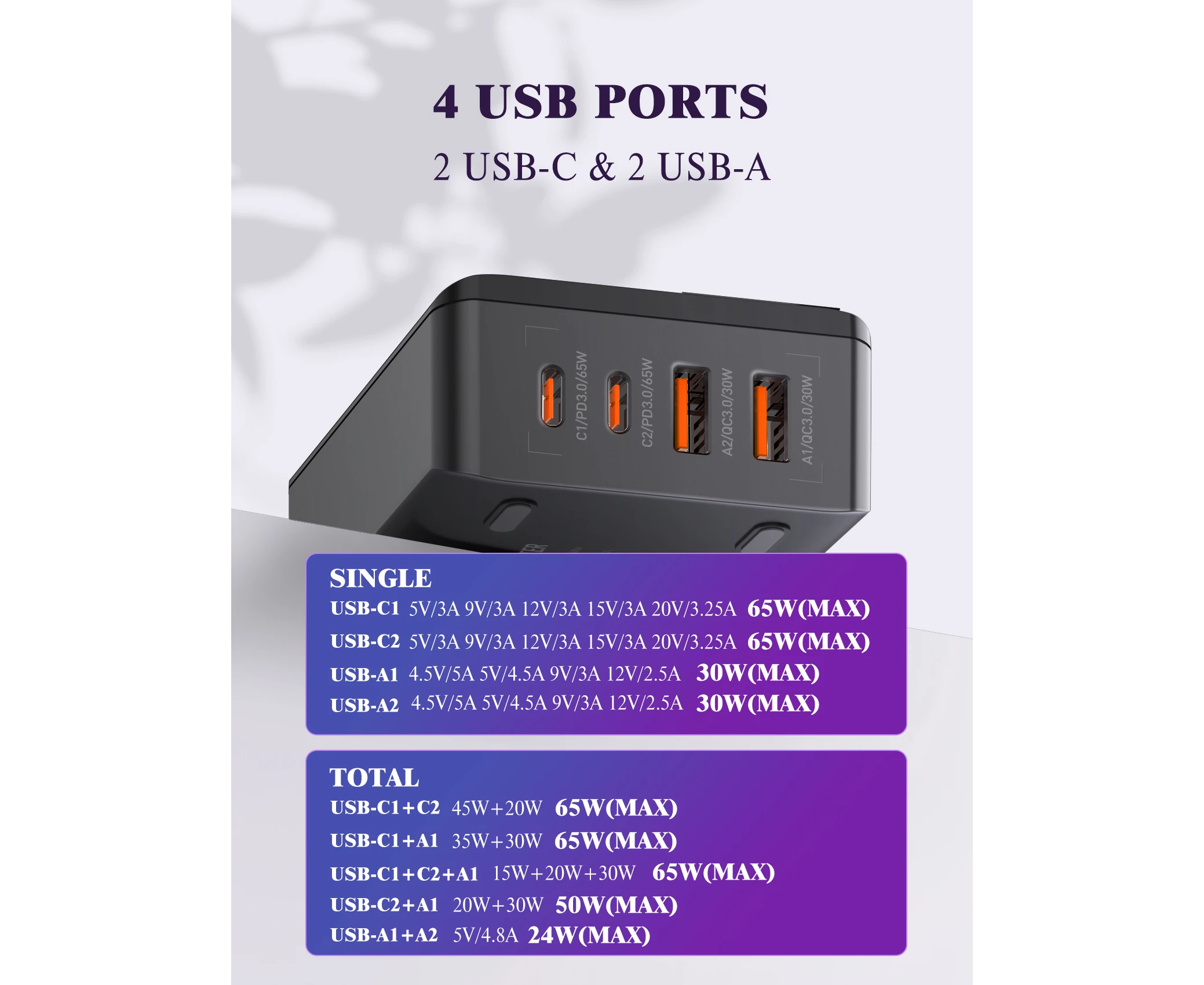 Выходной интерфейс 4-Ports USB: 2xUSB-A, 2xUSB-C