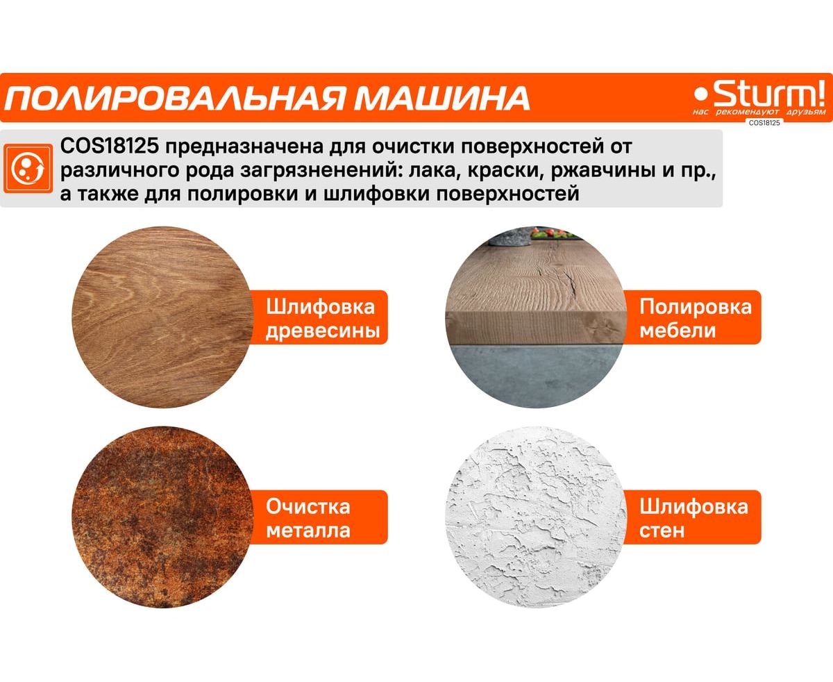 Шлифмашина COS18125 18В, 1BatterySystem, предназначена для очистки поверхностей от различного рода загрязнений: лака, краски, ржавчины и пр., а также для полировки и шлифовки поверхностей.