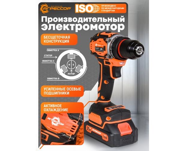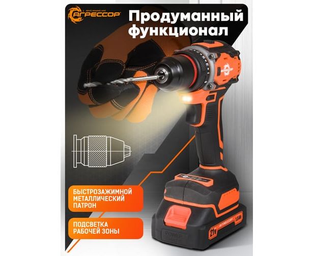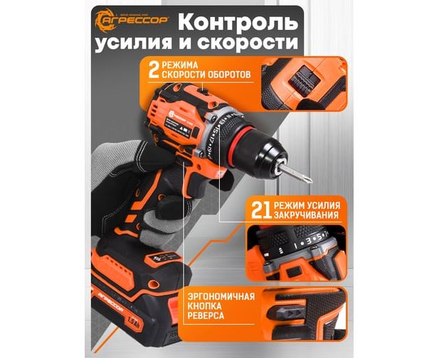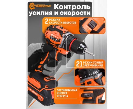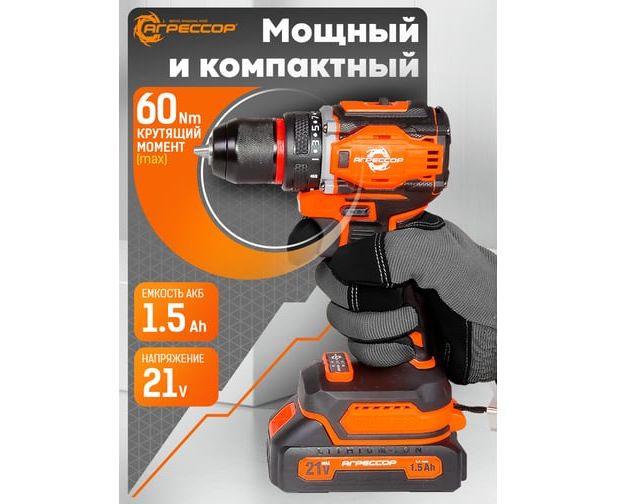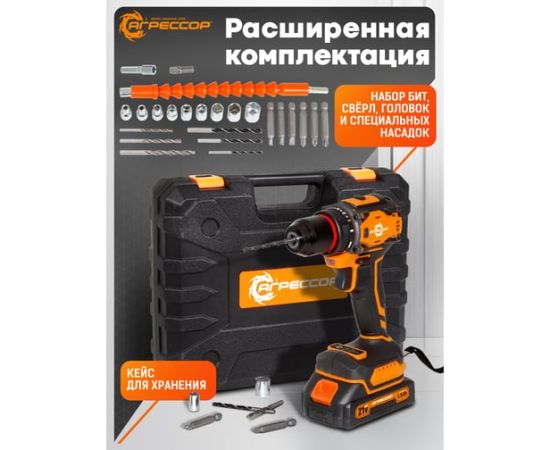 Шуруповерт Агрессор SH-060W 60 Nm, 21V/1.5А, бесщеточный мотор, АКБ 2 шт., зарядное устройство 220В, набор насадок 24 шт., пластиковый кейс