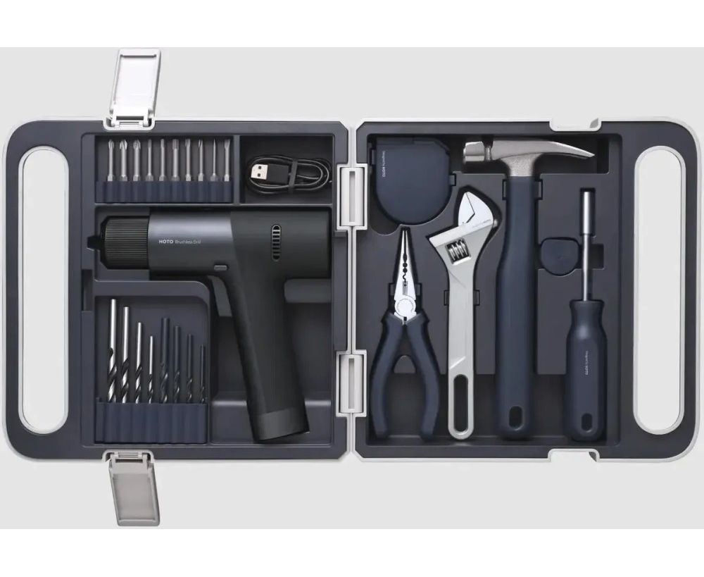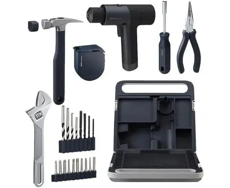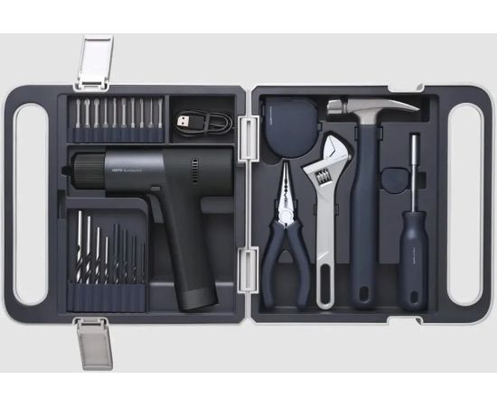 Дрель-шуруповерт, 10 бит из легированной стали S2, 4 сверла по дереву, 4 сверла по металлу, молоток с прорезиненной рукоятью, резиновый колпачок, измерительная лента 3 м. с системой автоблокировки, универсальные плоскогубцы с игольчатым наконечником, регулируемый гаечный ключ, зарядный кабель, кейс.