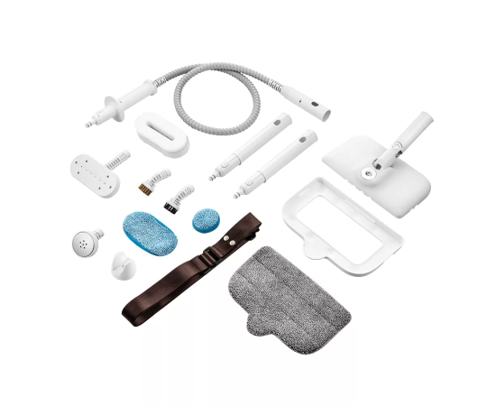 подача пара 21-25 мл/мин; длина шнура 5 м; максимальная температура нагрева 110 °C; комплектация: наплечный ремень, тряпка для отпаривания, удлинительная ручка, рамка для ковра, шланг-удлинитель, настенный кронштейн, фильтр для воды, губка с держателем, игла для очистки