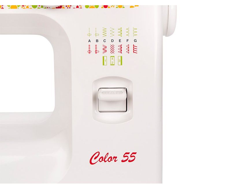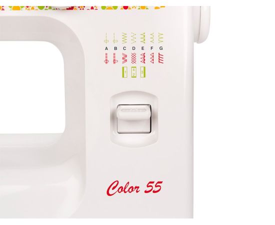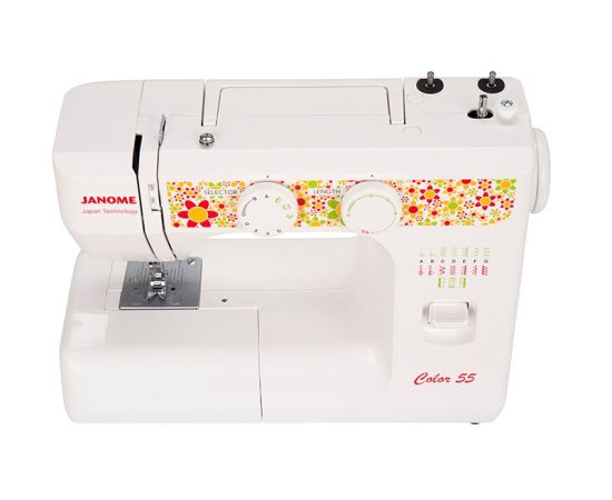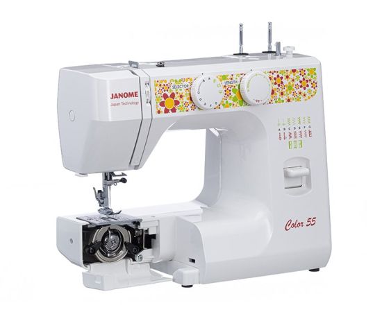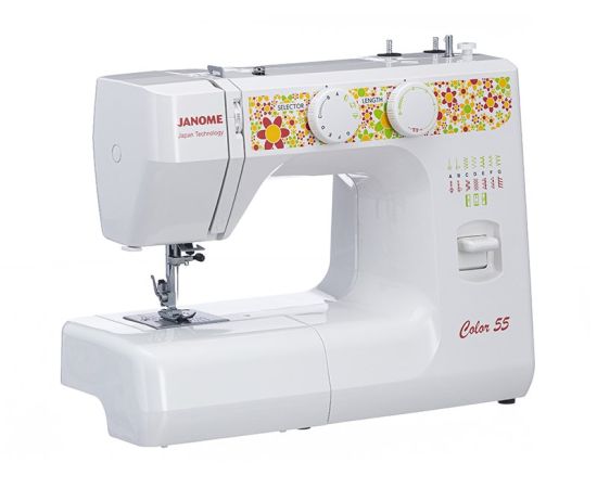 Электромеханическая швейная машина Janome Color 55 имеет все основные швейные операции: рабочие, трикотажные, оверлочные, потайные, а также декоративные строчки. Петля выполняется в полуавтоматическом режиме. Janome Color 55 имеет съёмную рукавную панель, которая позволяет без проблем шить узкие изделия, такие как манжеты рукавов, брючины и детские вещи. Это простая в управлении швейная машина подойдёт и новичкам, и тем, кто уже умеет неплохо шить.