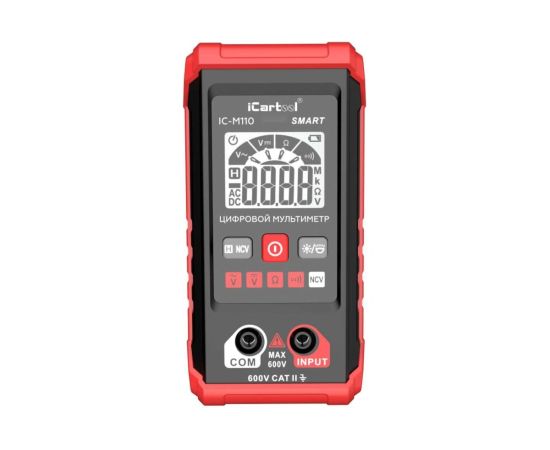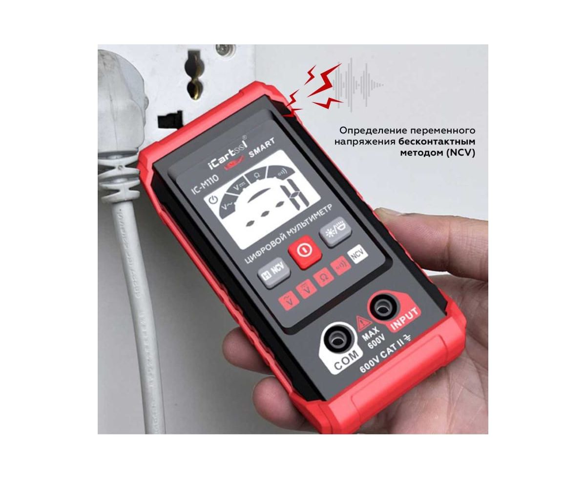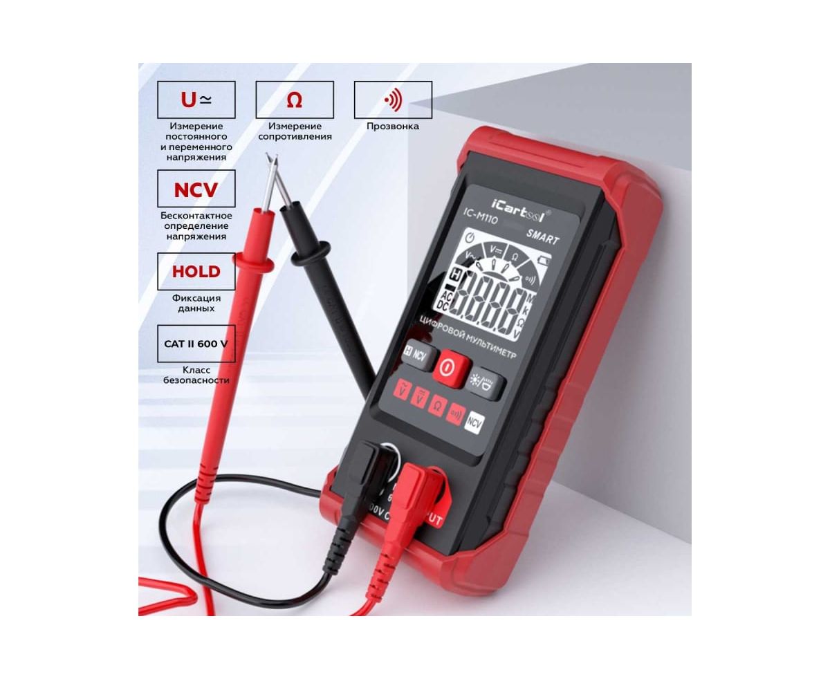 Смарт мультиметр iCartool IC-M110 с автоматическим выбором режима измерений. Имеет контрастный дисплей, компактные размеры, защитный резиновый чехол и функцию определения переменного напряжения бесконтактным методом (NCV). Яркий светодиодный фонарик обеспечивает подсветку рабочей зоны, а экран отображает полярность, измеряемый параметр и его значение. Прибор имеет звуковую и световую индикацию. Незаменим для ремонтных работ по электрике в быту и гараже, идеален для первых шагов в работе с мультиметрами.