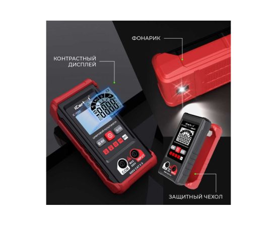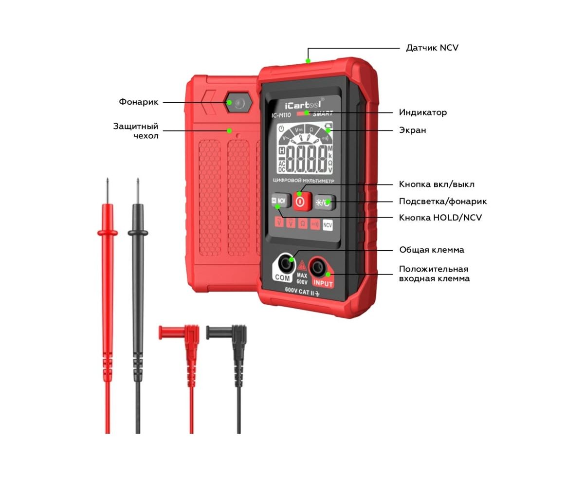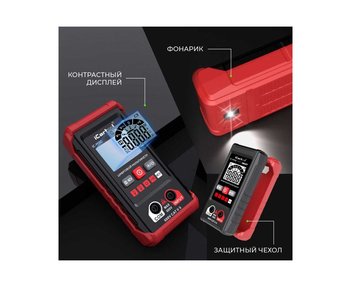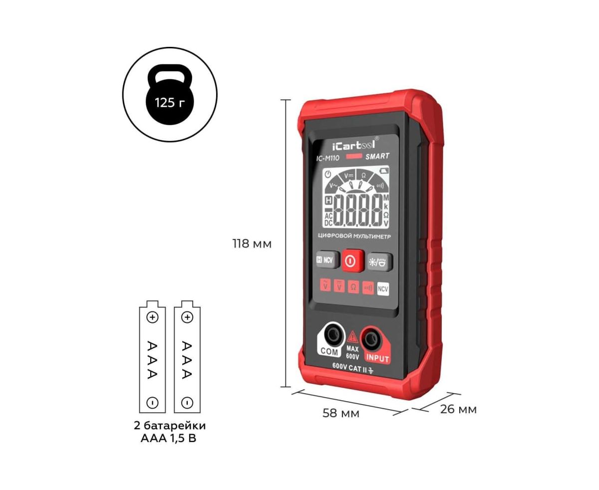 Смарт мультиметр iCartool IC-M110 с автоматическим выбором режима измерений. Имеет контрастный дисплей, компактные размеры, защитный резиновый чехол и функцию определения переменного напряжения бесконтактным методом (NCV). Яркий светодиодный фонарик обеспечивает подсветку рабочей зоны, а экран отображает полярность, измеряемый параметр и его значение. Прибор имеет звуковую и световую индикацию. Незаменим для ремонтных работ по электрике в быту и гараже, идеален для первых шагов в работе с мультиметрами.