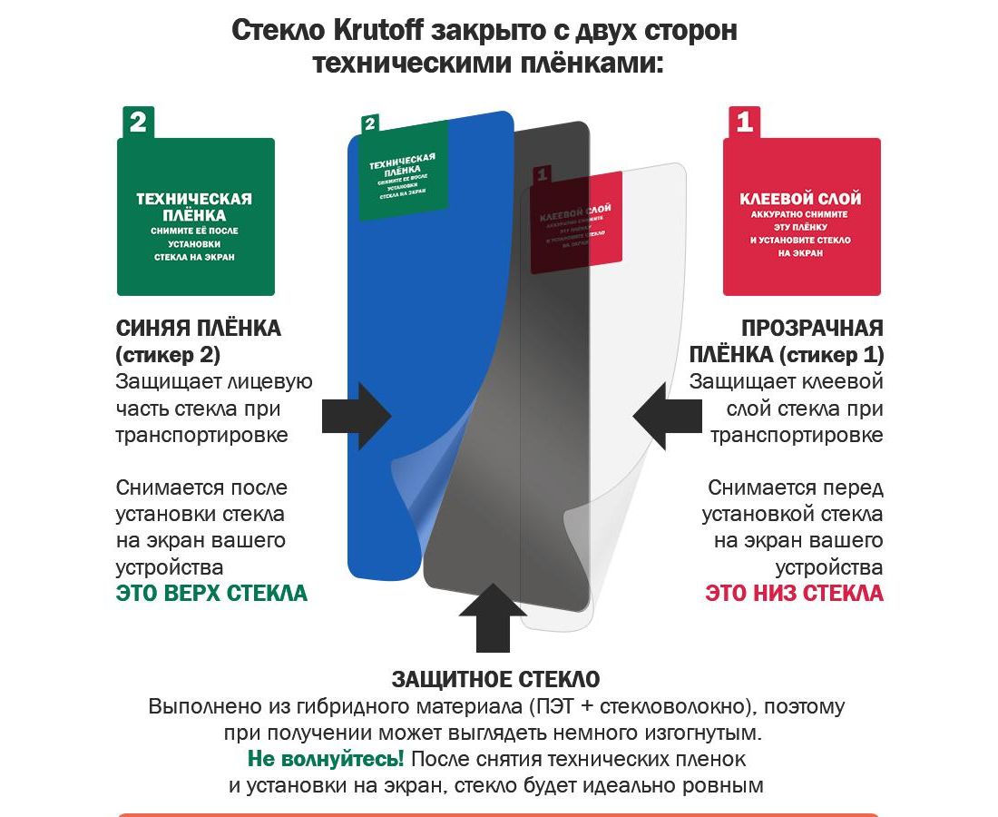 Сохранив гибкость защитной пленки, гибридное стекло намного удобнее обычного закаленного стекла - как при транспортировке, так и при установке. Оно тоньше, прочнее и надежно защищает экран от повреждений. Стекло антишпион не только защитит телефон от механических повреждений, но и скроет экран вашего смартфона от любопытных взглядов. Благодаря специальному свойству, изображение на экране видно только под прямым углом. Со стороны экран будет выглядеть как при выключенном дисплее. Стекло имеет отступы по 1 мм от края дисплея для удобства ношения защитного чехла. Имеет высокую степень устойчивости к царапинам, обеспечивает хорошую чувствительность к касанию и не влияет на сенсорный отклик по всей поверхности дисплея. Гибридное стекло идеально прозрачное, не снижает четкость и яркость изображения, не меняет оригинальную цветопередачу экрана. Изготовлено из гибкого композиционного материала (стекловолокно и ПЭТ). Является гибким и не растрескивается, а края не крошатся, как у обычного закаленного стекла. Защищает от пыли, грязи, брызг и царапин. Верхний слой из стекловолокна по тактильным ощущениям близок к стеклу и не влияет на работу сенсора по всей поверхности экрана. Полная проклейка поверхности (Full Glue). Специальная смесь высококачественных клеев гарантирует установку без пузырьков воздуха и что стекло не отслоится с течением времени. Внимание! Гибридное стекло поставляется в двух защитных транспортировочных пленках (на тыльной и лицевой стороне). Данные пленки могут быть поцарапаны. После наклеивания стекла снимите защитную синюю пленку "2" с лицевой стороны!