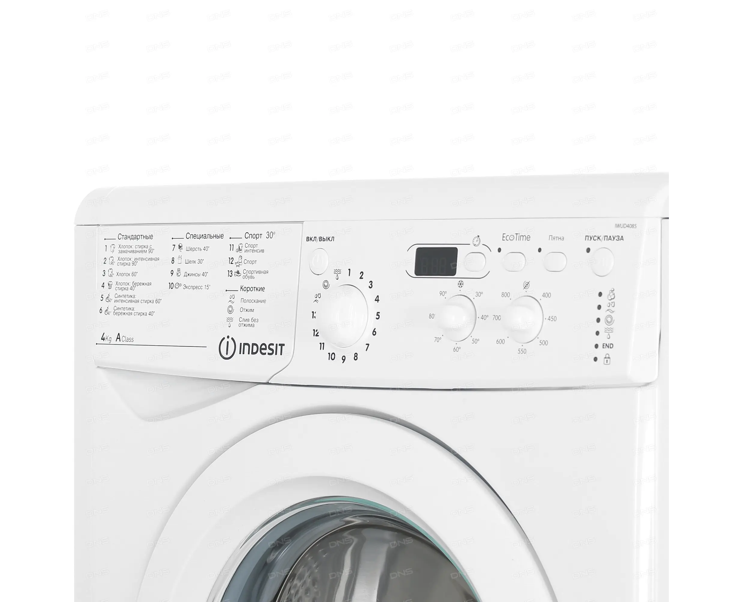 EcoTime, выбор скорости отжима, выбор температуры стирки, отсрочка старта, пятна, старт/пауза