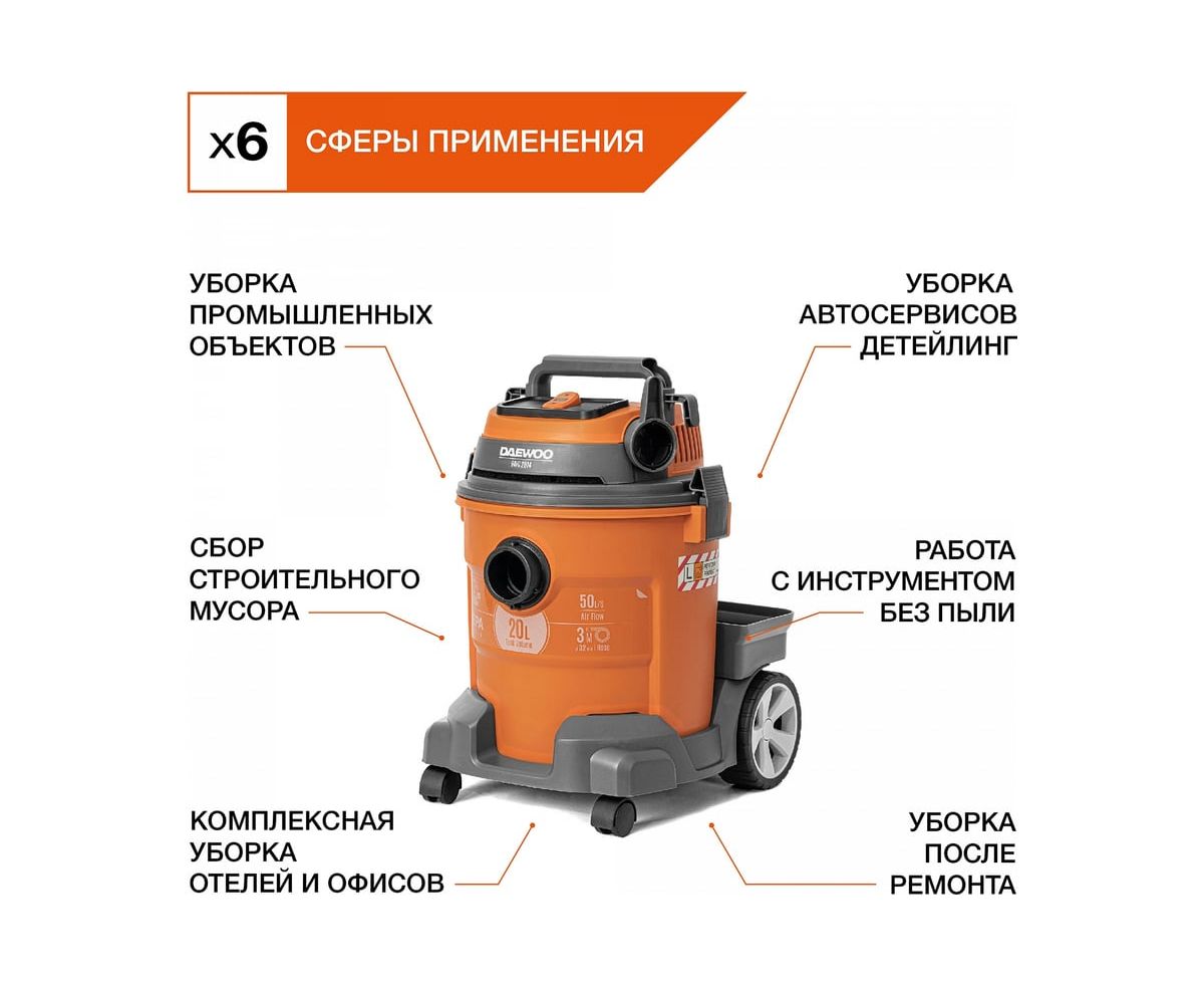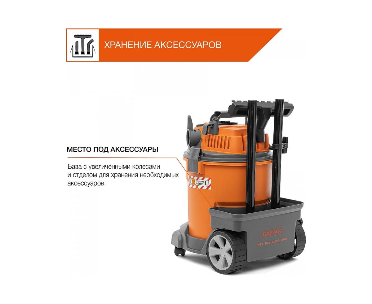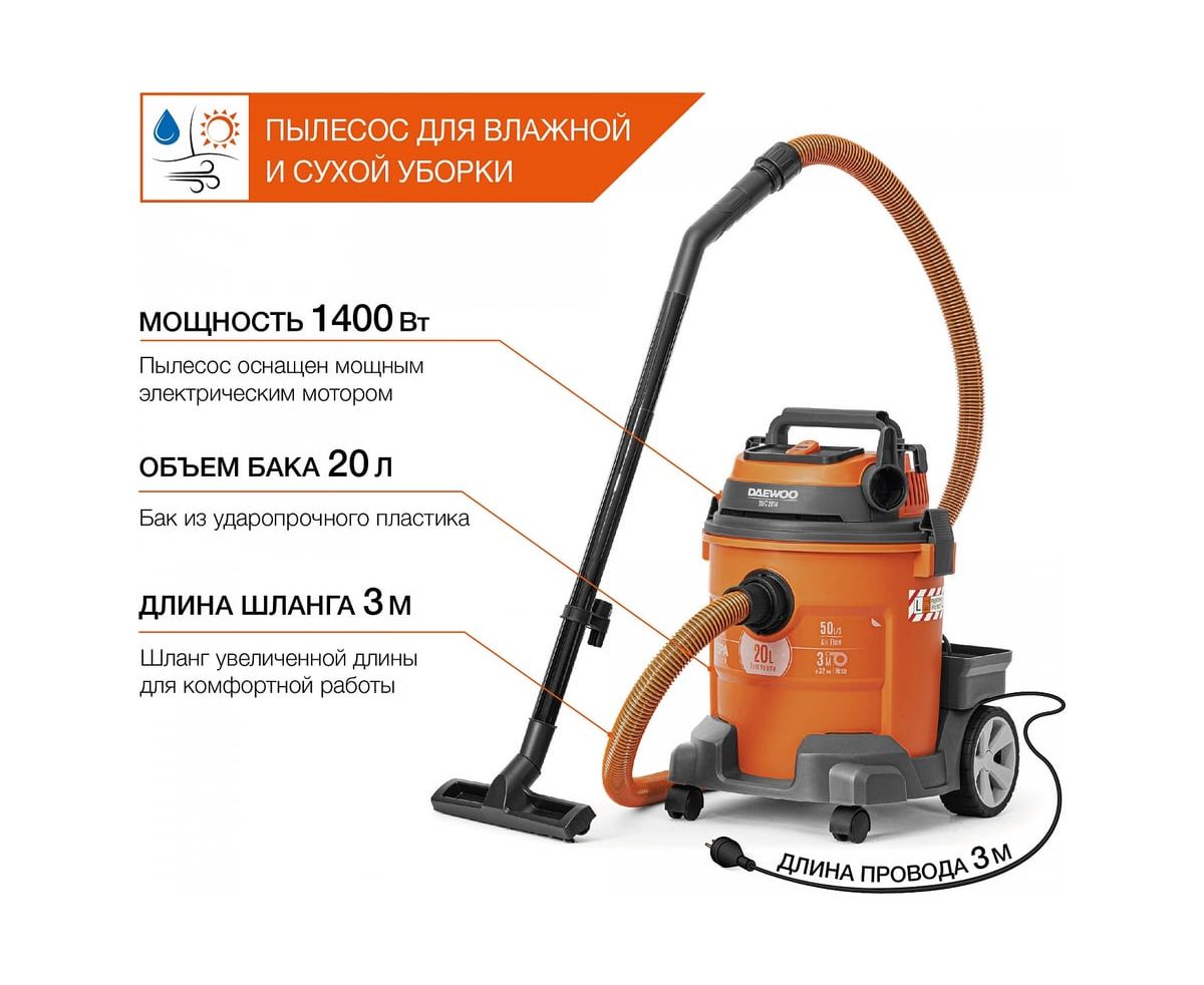 Строительный пылесос Daewoo DAVC 2014 1400Вт (уборка: сухая/сбор воды/выдув) оранжевый
