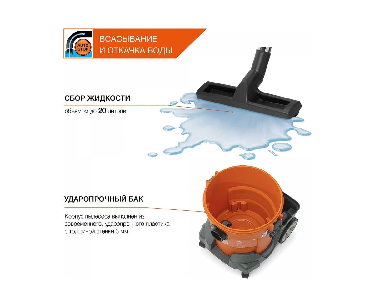 Функция всасывания и откачки воды позволяет эффективно собирать жидкость с любого покрытия в объеме до20 литров.