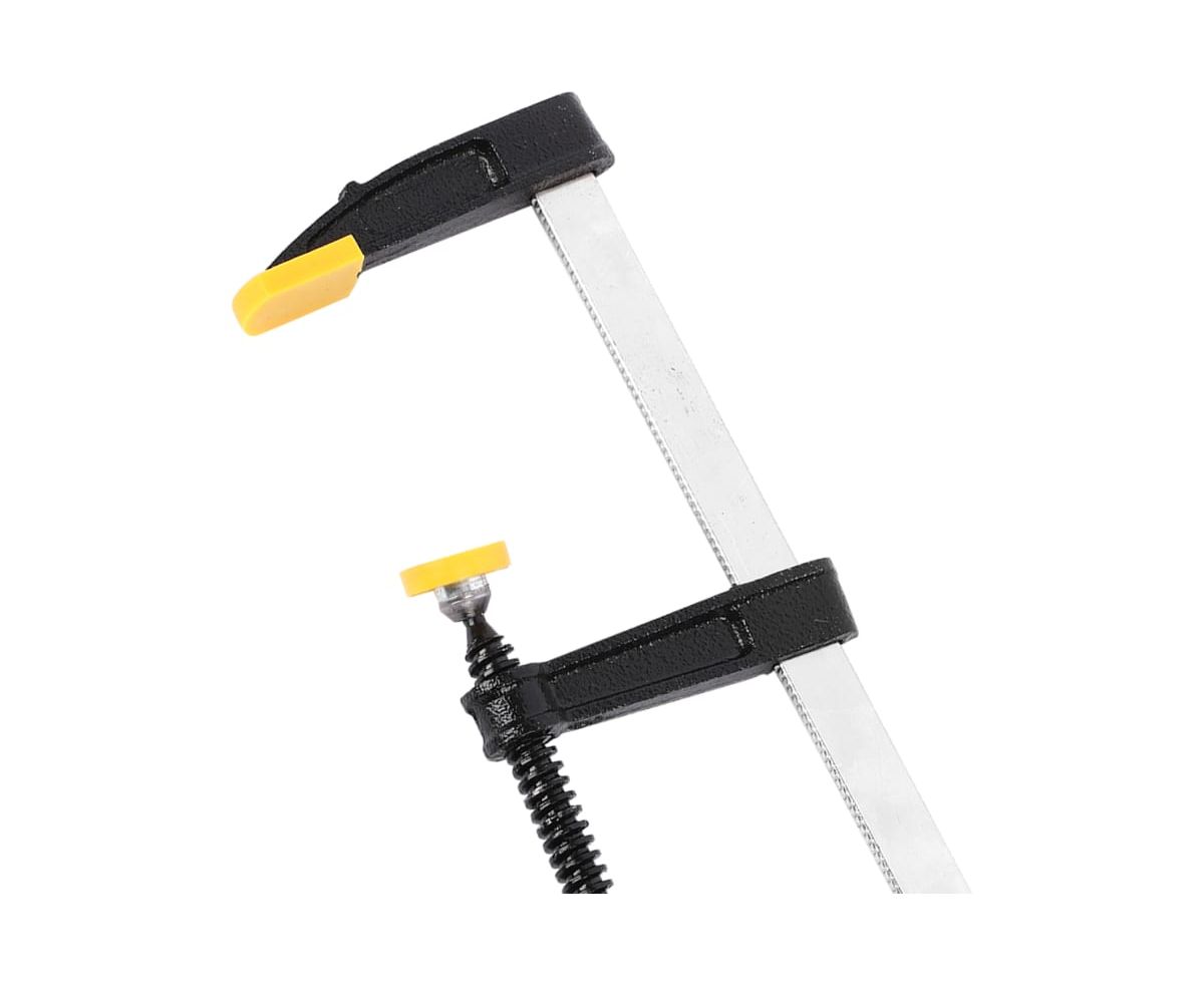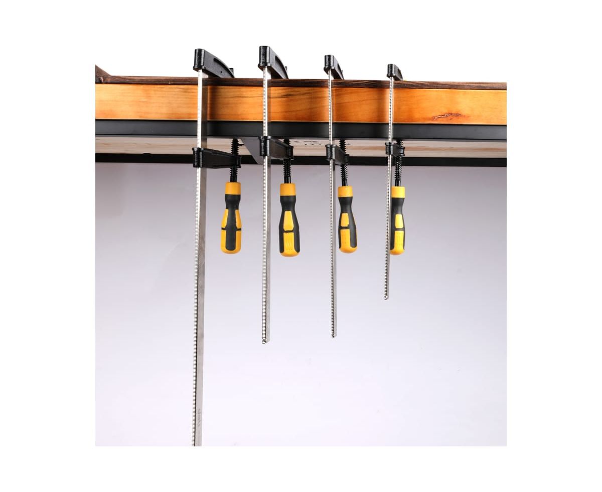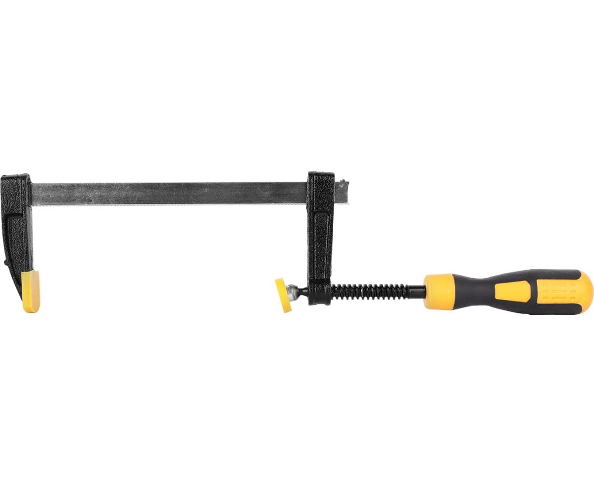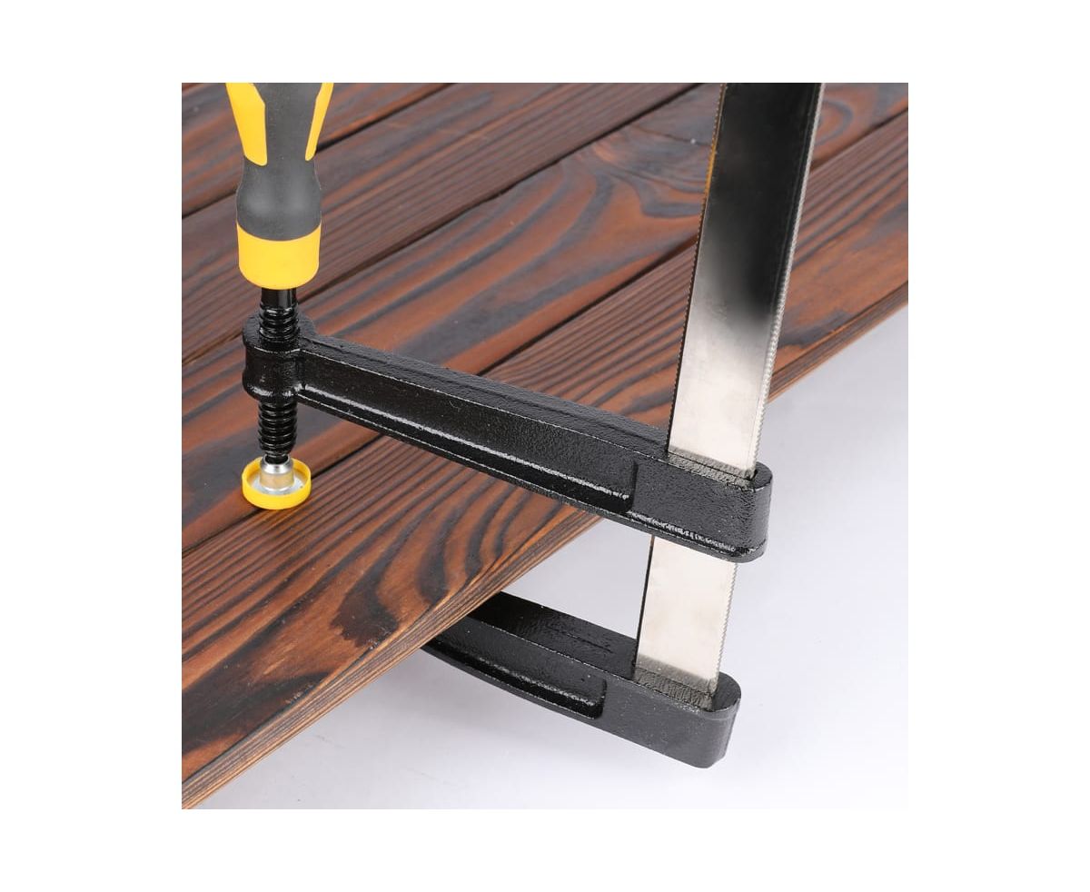 Столярная F-образная струбцина используется в столярном, слесарном и плотницком деле и позволяет фиксировать заготовки из металла, древесины, пластика и других материалов для их соединения, обработки, склеивания, шлифовки, сверления и пр. Ширина зажима составляет 300 мм, а глубина до 120 мм. Штанга изготовлена из высококачественной стали А3 и толщиной 5 мм устойчива к деформации и прослужит долго. Диаметр резьбового стержня 12 мм. Максимальное усилие зажима 2000 Н. Эргономичная, двухкомпонентная рукоять удобно лежит в руке и обеспечивая комфорт во время работы.