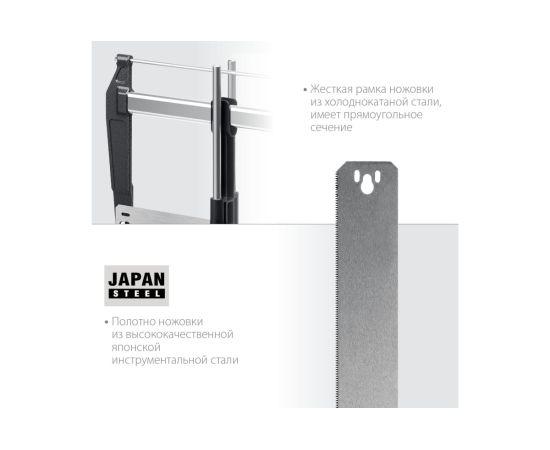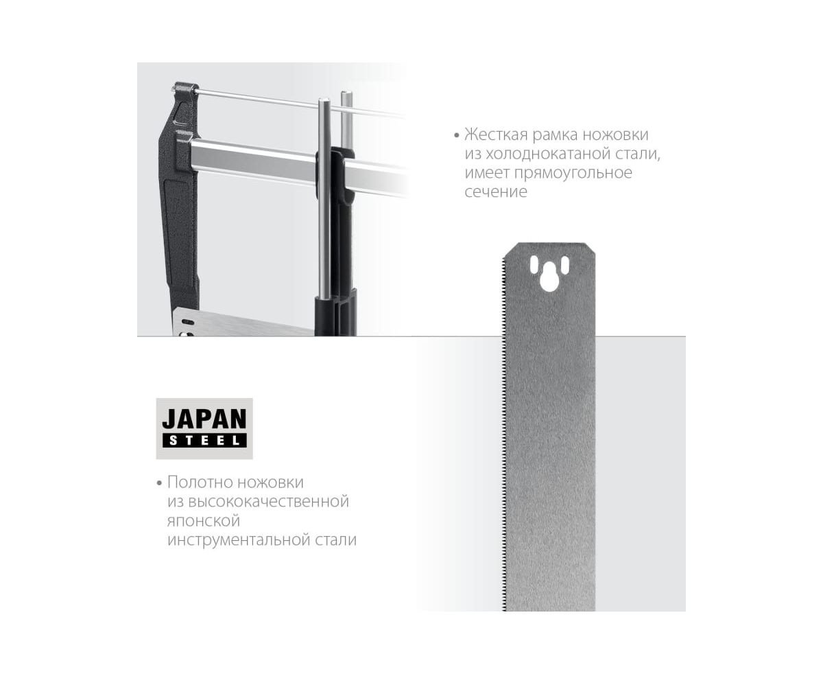 Рамка ножовки изготовлена из холоднокатаной стали и имеет точное прямоугольное сечение. Основание изготовлено из высококачественного ударопрочного пластика.