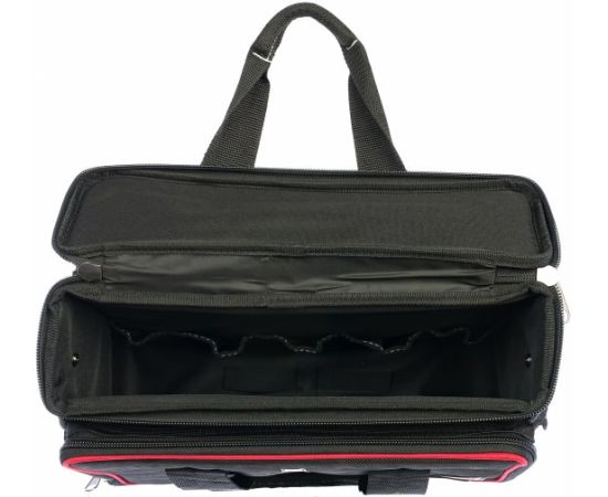 Сумка монтажника изготовлена из водонепроницаемого нейлона и обладает высокой прочностью. Имеет одно жесткое внутреннее отделение, два вместительных наружных кармана и откидывающиеся боковые секции с несколькими отделениями. Прошитые мягкие ручки обеспечивают удобство при переноске. Грузоподъемность сумки достигает 20 кг.