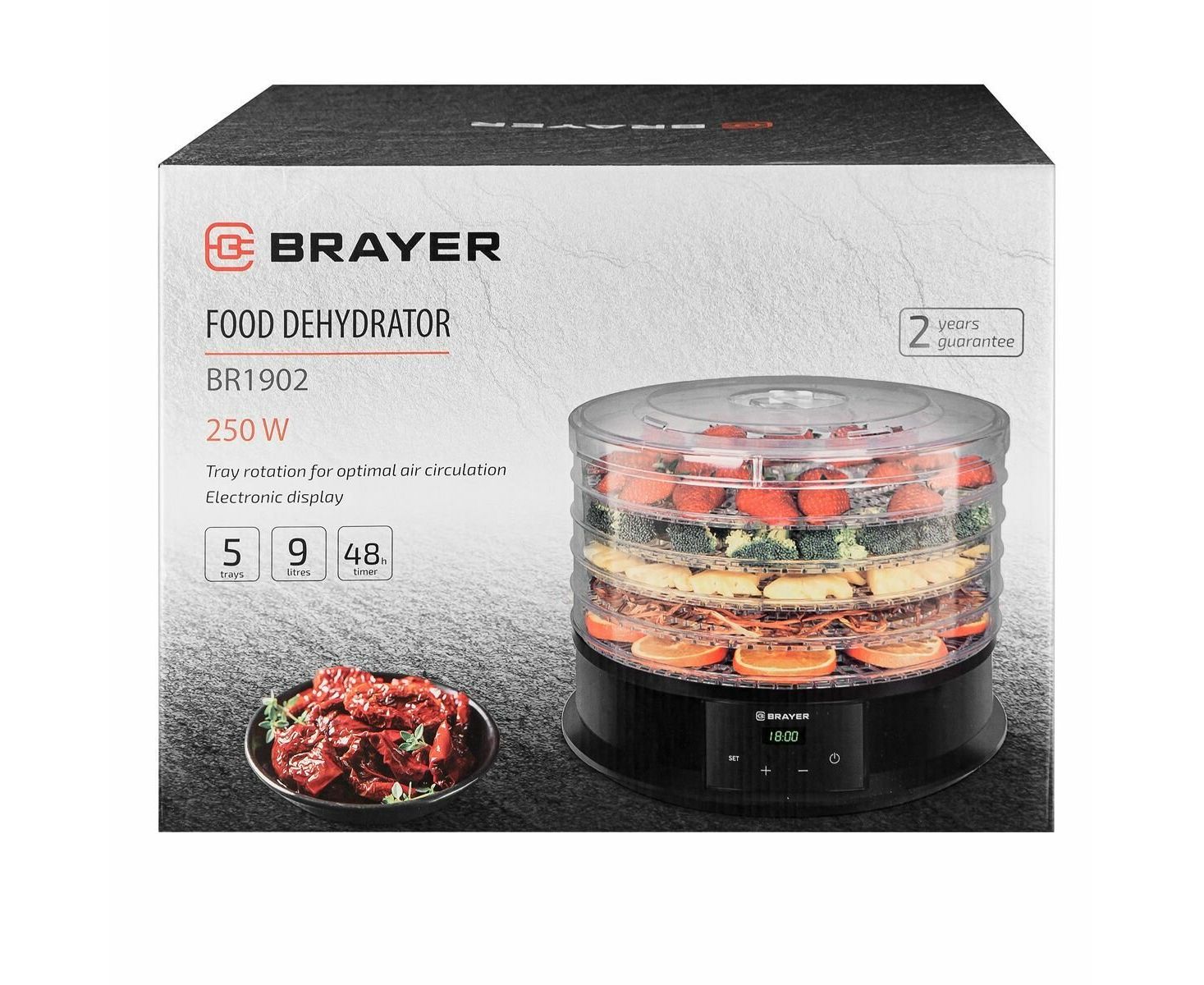 Сушилка для овощей BRAYER 1902BR 250 Вт 5 поддонов размер 32x32 см регулировка температуры таймер 48 ч BR1902 предназначена для просушки фруктов, овощей, ягод, грибов, зелени.