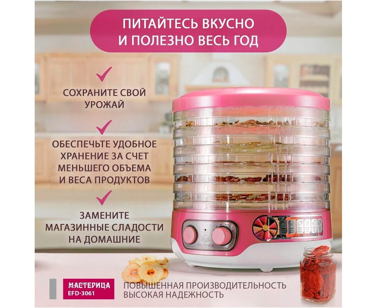 Яркая и современная сушилка для овощей Мастерица EFD-3061 розового цвета с перламутром станет не только помощницей на кухне и даче, но и украсит интерьер. За счет компактных размеров дегидратор не займет много места в квартире, а бесшумная работа прибора не доставит неудобств.