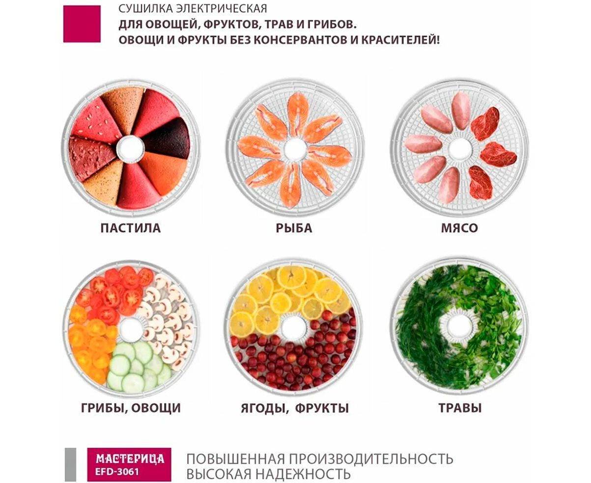 Используйте электросушилку для овощей и фруктов Мастерица EFD-3061 как дегидратор для мяса или рыбы и угощайте близких различными деликатесами, а со специальным поддоном для пастилы вы откроете для себя мир полезных сладостей.