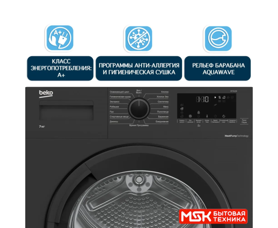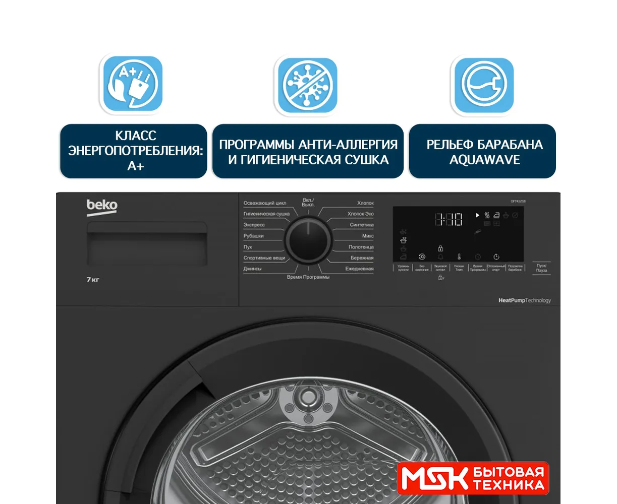 Сушильная машина Beko DF7412GB с максимальной загрузкой барабана 7 кг и 15 программами. Сушильная машина оснащена функциями разглаживания и охлаждения белья, а также блокировкой кнопок от случайного нажатия и функцией отложенного старта до 24 часов. Модель оснащена тепловым насосом Heat-Pump, который обеспечивает высокий результат сушки при низкой температуре и минимальном энергопотреблении.