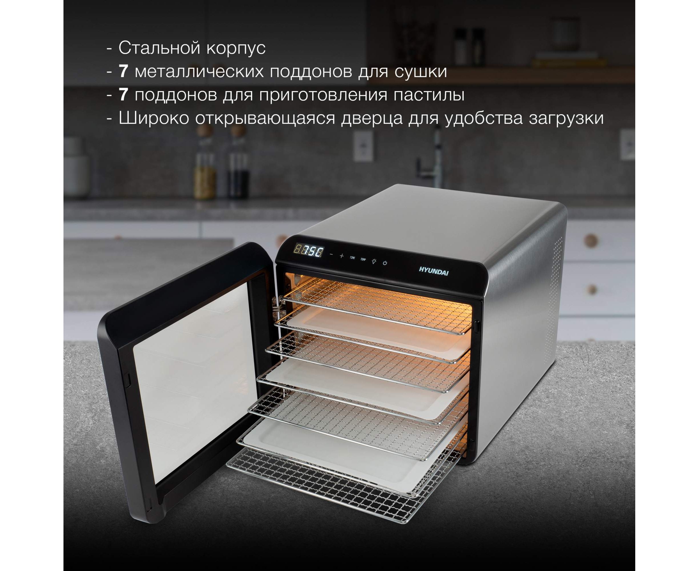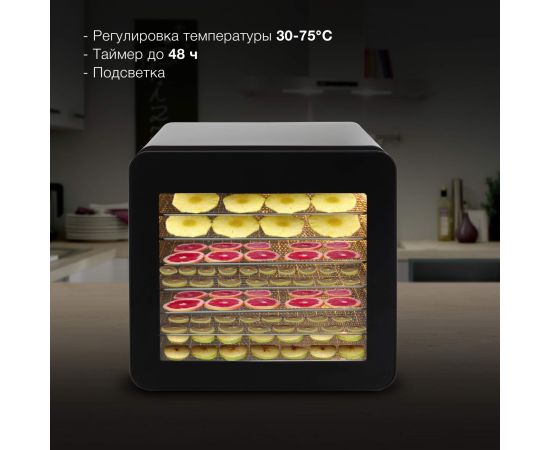 Сушильная камера в металлическом корпусе, с регулировкой температуры и таймером, для сушения овощей и фруктов, грибов и трав, а так же вяленья мяса и рыбы. Весь необходимый функционал, в удобном форм-факторе с сенсорным управлением.
