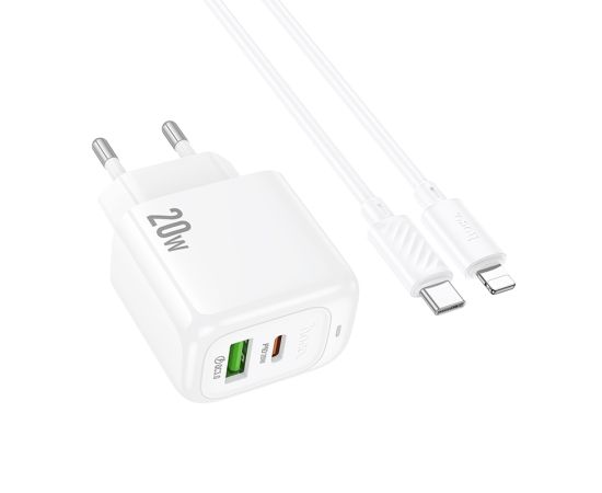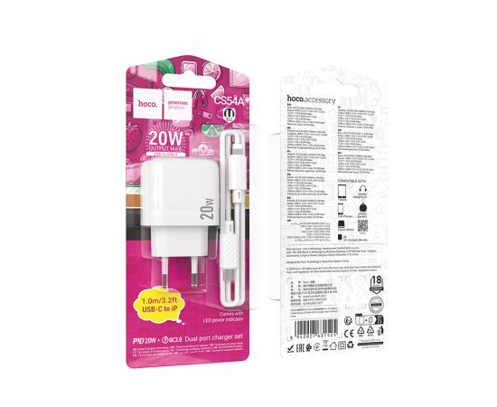 СЗУ 1USB+1Type-C 3.0A QC3.0 PD 20W быстрая зарядка для Lightning 8-pin Type-C Hoco CS54A 1м (White)