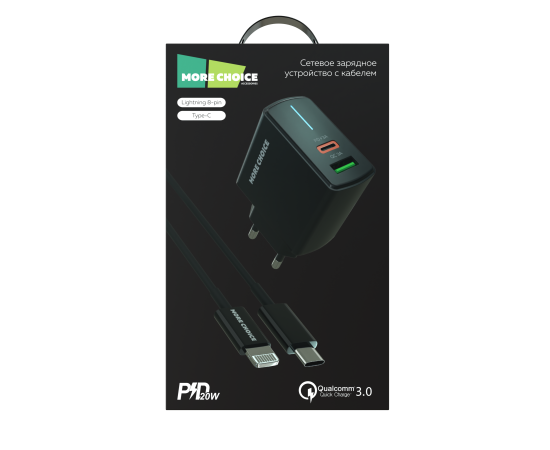 СЗУ 1USB+1USB-C 3.0A PD 20W+QC3.0 быстрая зарядка для Lightning 8-pin Type-C More choice NC61i (Black)