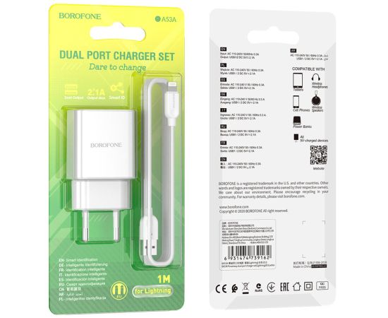СЗУ BOROFONE BA53A Powerway dual port 2,1А + lightning cable, (белый)