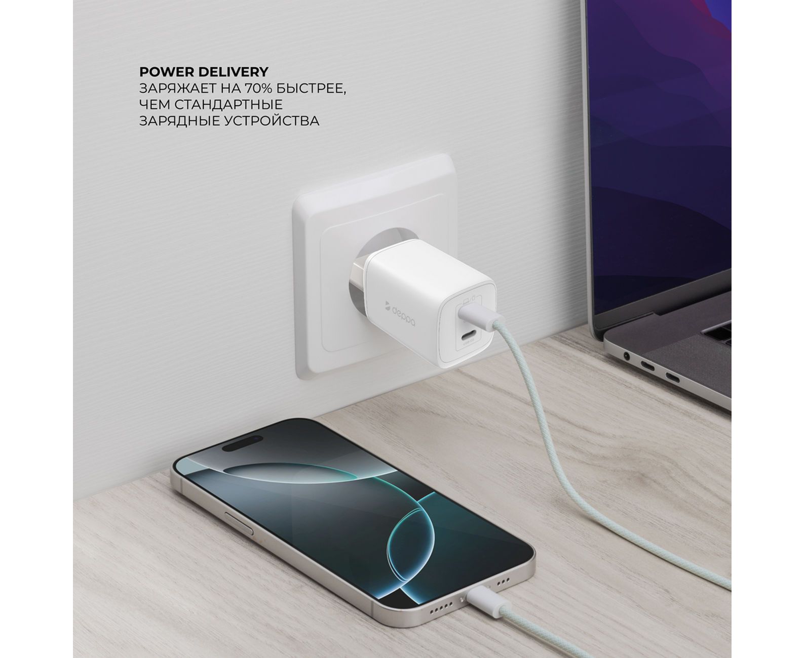 СЗУ 2xUSB-C, PD 3.0, QC 4.0, 65W, GaN, белый, Deppa