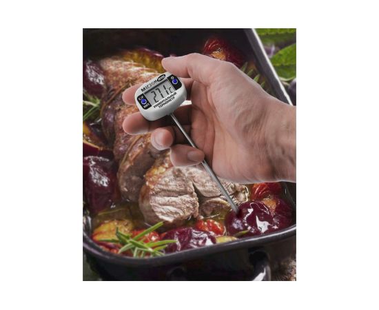 МЕГЕОН 26100 - новинка в модельном ряду цифровых термометров для промышленных и бытовых нужд. Представленная модель предназначена для замеров температуры с высокой точностью контактным методом в диапазоне -50 ... 300°C. Помимо этого изделие имеет вторую единицу измерения- Фаренгейты. Отличительной особенностью является возможность поворота экрана на 180°. Ручная установка единиц измерения и функция автоматического выключения при длительном простое, делают прибор более удобным в обращении. Зонд термометра изготовленный из нержавеющей стали, позволяет применять измеритель в отраслях связанных непосредственно с пищевыми продуктами, с нефтехимическими составами, с агрессивными жидкостями и материалами. Эргономичный дизайн и компактные размеры в полной мере смогут оценить профессионалы и любители.