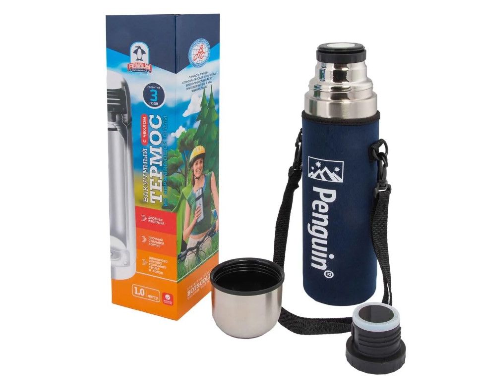 Термос с узким горлом, объем 1л, с двумя пробками: пробка с кнопкой (для удобства выливания жидкости) и глухая пробка (для более длительного сохранения температуры). Термос имеет неопреновый чехол, который обеспечивает защиту термоса от ударов и падений и добавляет 3-4 градуса к температурным показателям. Термос изготовлен из первоклассной нержавеющей стали. Все пластмассовые части сделаны из первичной пластмассы, не имеющей истории переработки.