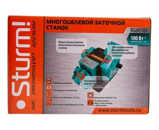 Многофункциональный точильный станок Sturm BG6010S применяется в небольших мастерских для заточки различного режущего инструмента (сверел диаметром 2-10 мм, лезвий рубанков шириной 6-51 мм, ножей, ножниц). Выполнение работ обеспечивает шлифовальный круг диаметром 49.3 мм. Защитный экран из прозрачного пластика дает возможность оператору визуально наблюдать выполнение операции. Станок имеет малые габаритные размеры и вес, что позволяет с легкостью переносить установку.