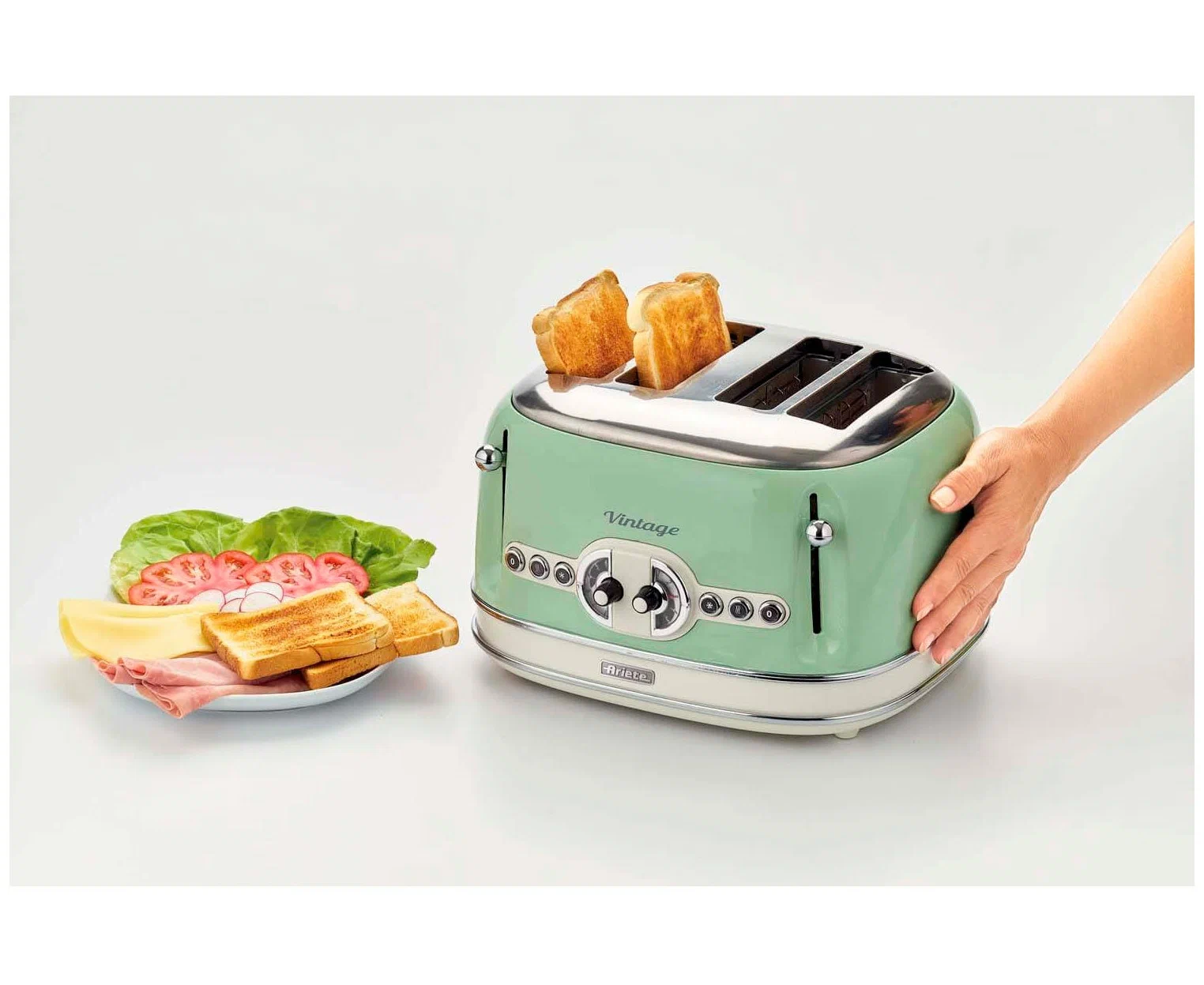 Основные характеристики Бренд Ariete Цвет товара зеленый Мощность 1600 Вт Количество отделений 4 Количество тостов 4 Тип управления электронное Дополнительные характеристики Особенности термоизолированный корпус Дополнительные функции Защита от перегрева Дополнительные режимы функция подогрева, функция размораживания В комплекте поддон для крошек Материал корпуса пластик/ металл Длина сетевого шнура 100 см Дополнительная информация 6 степеней обжаривания; экстра-подъем тостов