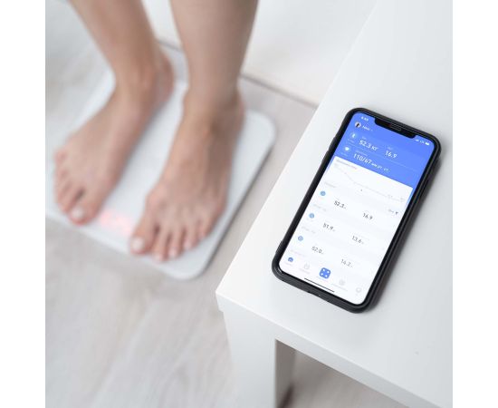 За изменениями веса, индекса массы тела, скорости базового обмена веществ и общей оценкой можно следить в журнале или на удобном графике прямо на главной странице приложения. Оно доступно для iOS и Android. Данные от весов синхронизируются с Apple Health и Google Fit.