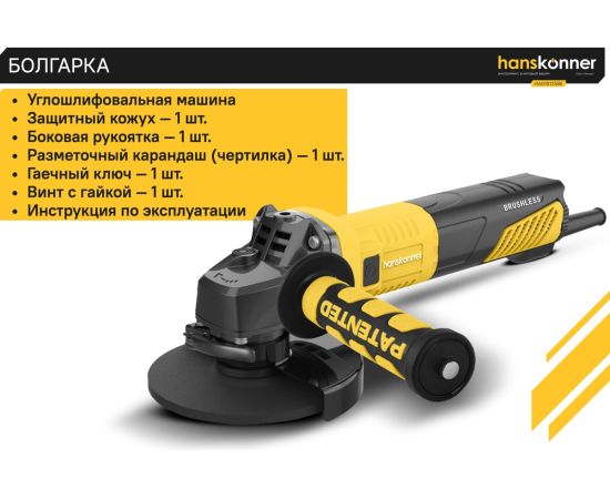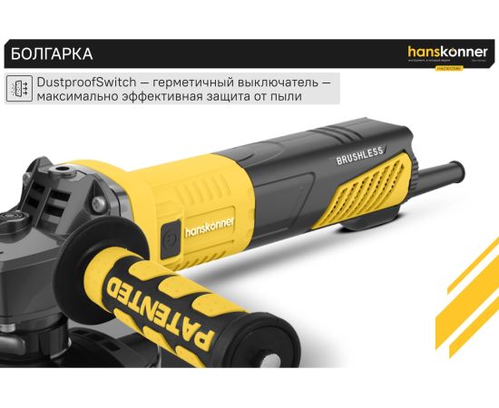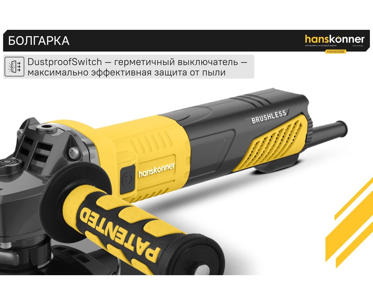 Угловая шлифовальная машина Hanskonner HAG16125BE — мощный и компактный электроинструмент для шлифования и зачистки поверхностей, а также резки металлов, кирпича, керамики или камня без использования воды. Данная модель имеет бесщеточный электродвигатель мощностью 1600 Вт и фирменные японские подшипники NSK, что повышает продуктивность и рабочий ресурс. Также, ресурс инструмента, подкреплен герметичным выключателем, функцией плавного пуска и защитой от перегрузки двигателя.