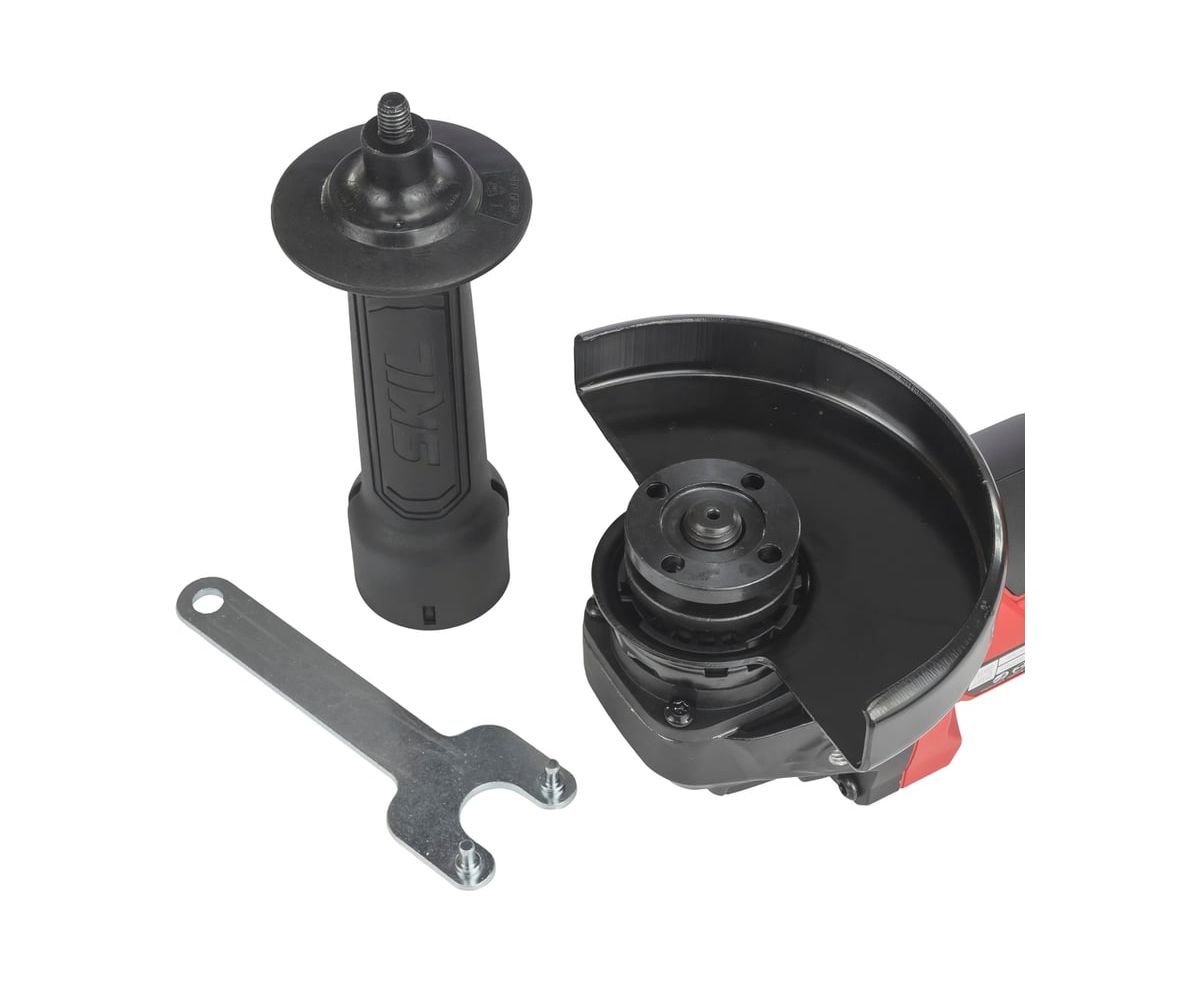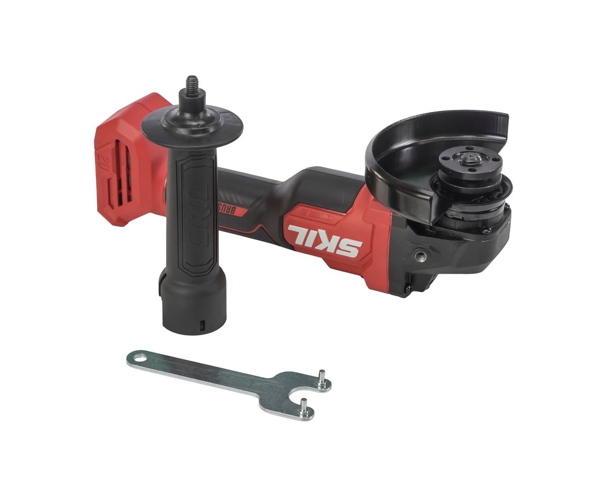 Защитный кожух регулируется без инструмента с помощью системы CLIC — для быстрой адаптации под направление искр. Фиксация шпинделя упрощает замену оснастки, а защита от случайного пуска блокирует включение инструмента при установке аккумулятора, если переключатель уже находится во включённом положении.